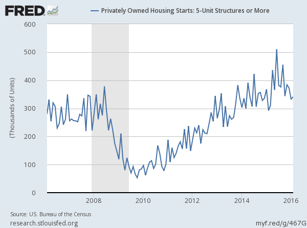 One of the byproducts of the financial crisis that began for the consumer in 2008 has been tight credit. As I have said many times, the financial crisis was a credit crisis with housing as a symptom. We are still in the hangover phase of the crisis since credit conditions have not normalized. To be clear, mortgage lending is less restrictive by non-bank lenders than it is with bank lenders, but it remains a serious issue across the U.S. housing landscape. This is key driver for high rents and falling homeownership rates. New multi-family home starts have been grinding higher for that very reason – but is starting to cool off.