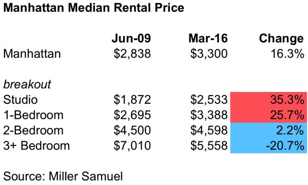 But when you look at the trajectory of rents since the end of the Great Recession, you can see how much more rents have risen in smaller apartments than larger apartments. With ahead of trend population growth and record job growth with no new supply to address the entry market, the market has hit some sort of affordability threshold, forcing many NYC renters to look further away from central business districts or the suburbs.
