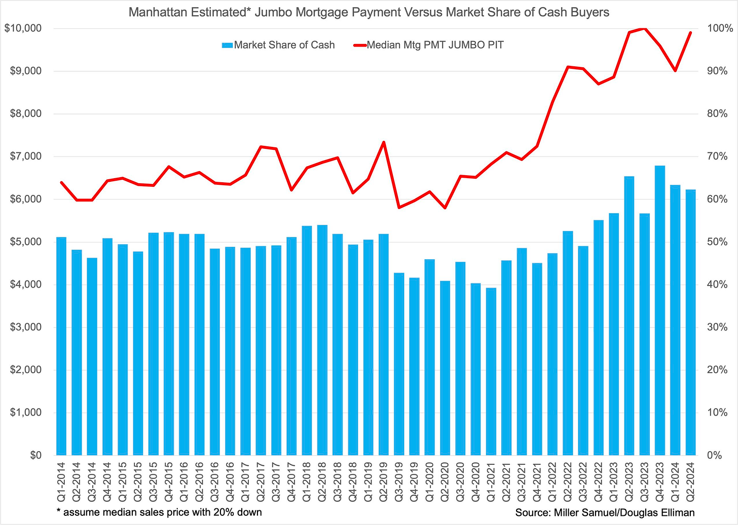 When looking at Manhattan’s median jumbo mortgage payment trend, the surge in cash buyers correlates well with the initial dip in payment due to the drop in interest rates in 2019 and then the surge in prices, followed by the jump in monthly mortgage payments coming out of the COVID crisis and Fed rate pivot in 2022.