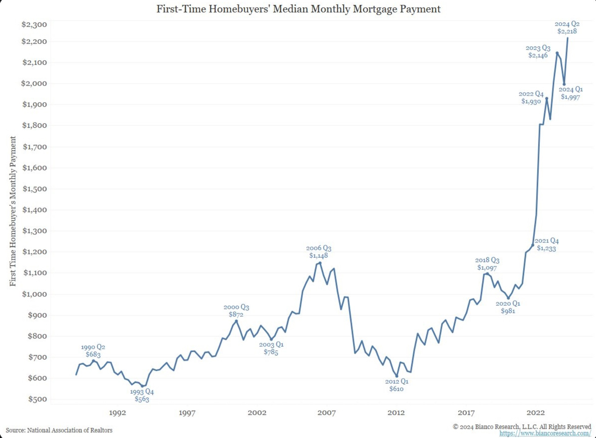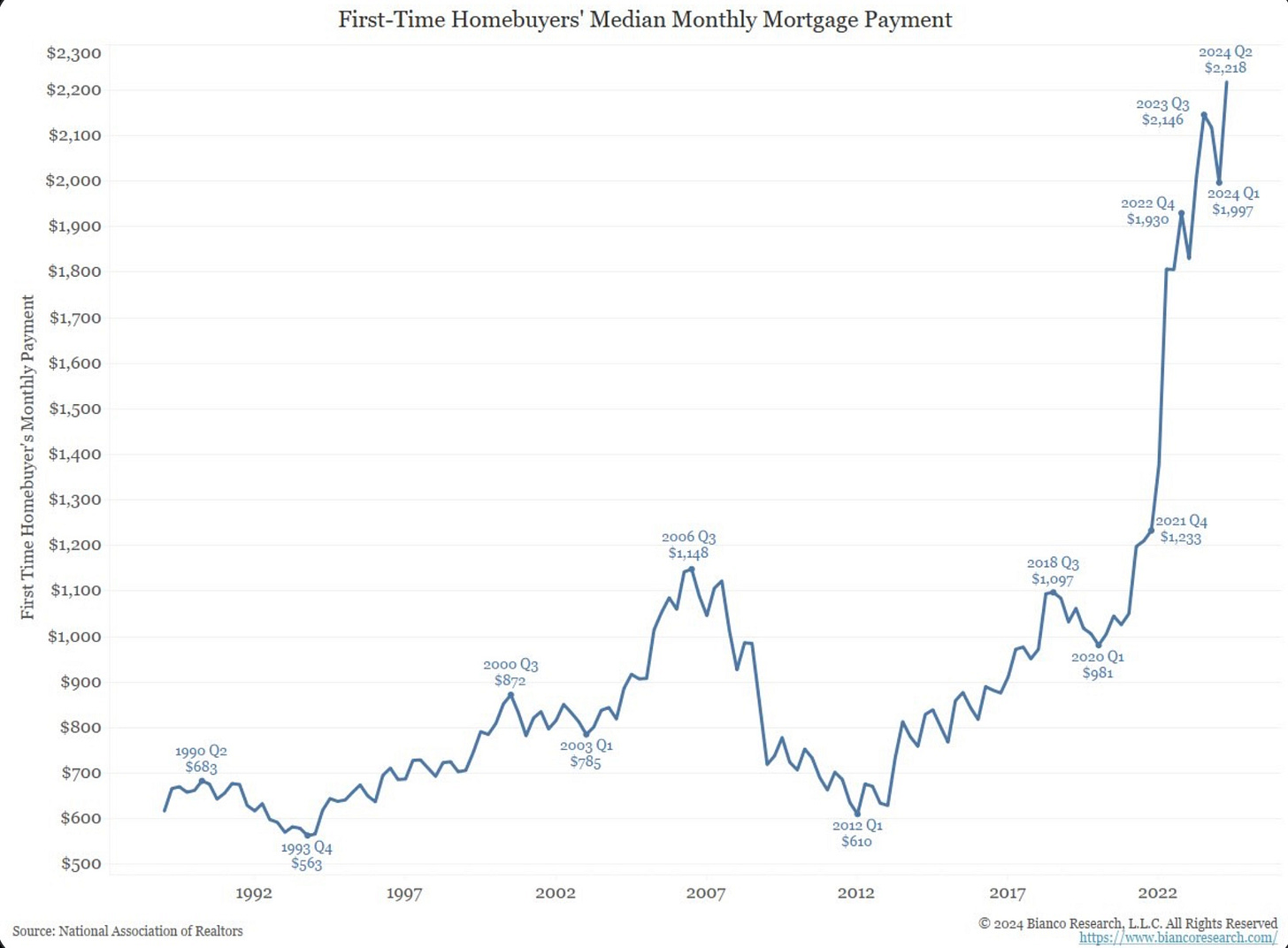 Monthly payments have been rising sharply for a decade, especially in the past two years. Mortgage payments actually dropped from 2007 through 2012 during the foreclosure crisis, temporarily pushing the market share even higher than in previous years. The ascent of monthly mortgage payments has been quite steep since the Fed rate pivot in early 2022.