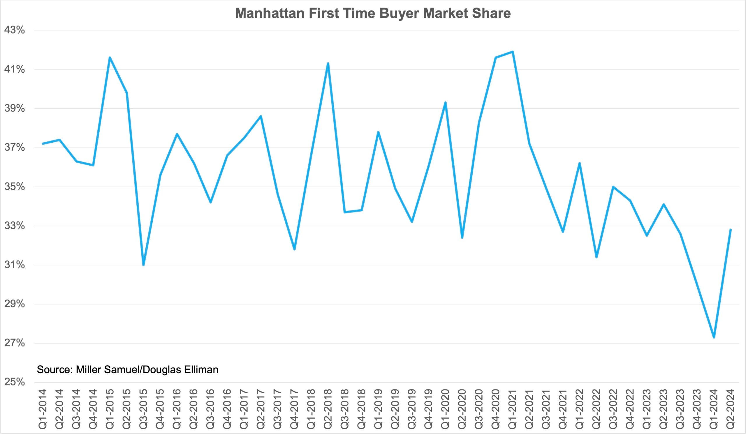 Within our decade of data, the market share of Manhattan first-time buyers has been falling, especially since the Fed rate pivot in early 2022, somewhat in line with the national trend.