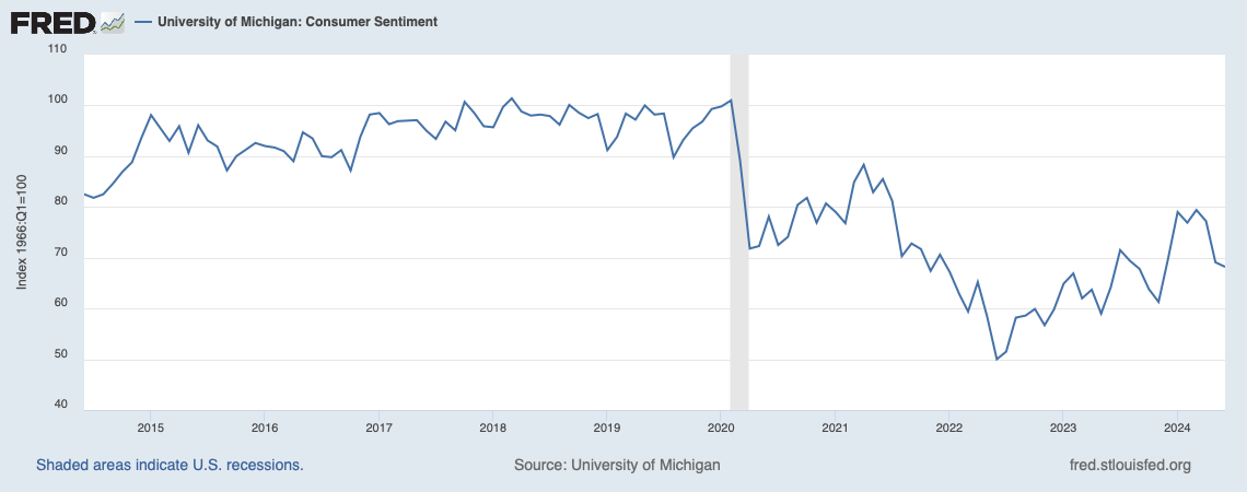 With so many surveys out there about how we “feel,” it can get a little confusing. The spike in mortgage rates and inflation, as well as the surge in housing prices over the past couple of years, has influenced many of us to do more swearing. Throw in a heated election-year political environment, and the frequency of f-bomb usage has likely surged. Because of this, I’ve grown more confident with the sentiment that more swearing will help me live longer. Two essential surveys track the way consumers feel about things: the Conference Board’s Consumer Confidence Index, which is more about the here and now, and the University of Michigan Consumer Sentiment Index, which is more forward-looking.