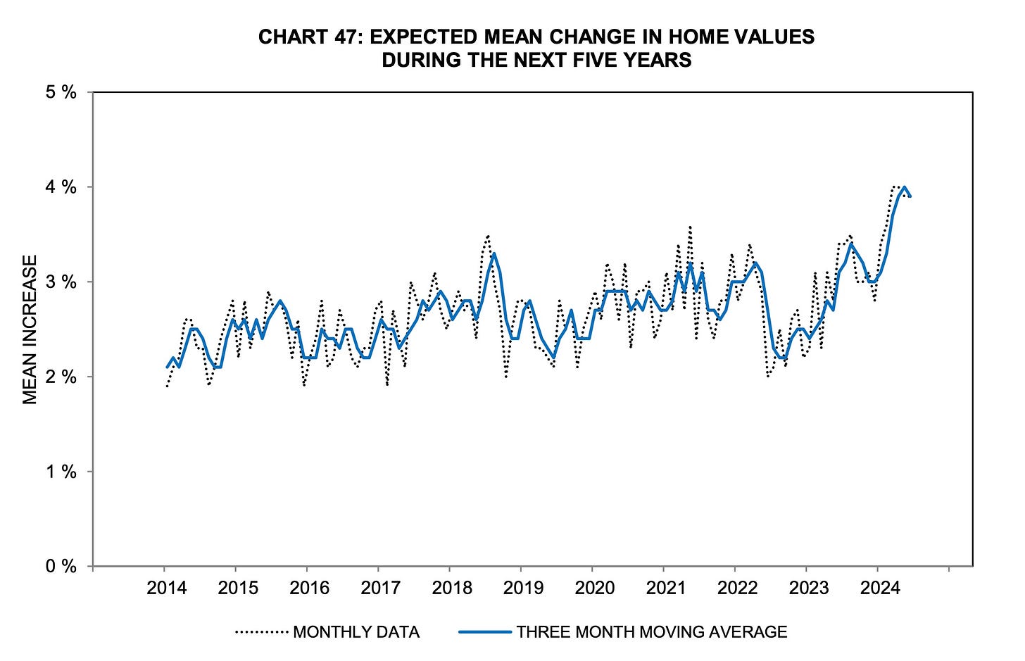Despite the spike in mortgage rates, consumers think home values will rise a lot over the next five years (as shown in the chart below). Perhaps that’s with the expectation that interest rates will continue to fall in the coming year. The survey shows value increases since mortgage rates began to surge in early 2022. Fascinating.