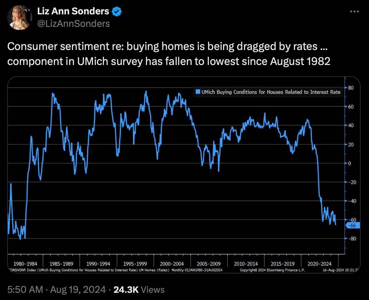 Yet in the context of buying homes, sentiment has plummeted to 1982 lows. I suspect the consumer outlook for lower rates this fall is not reflected in the available results quite yet and could be offset if the economy deteriorates a lot more (justifying more rate cuts).