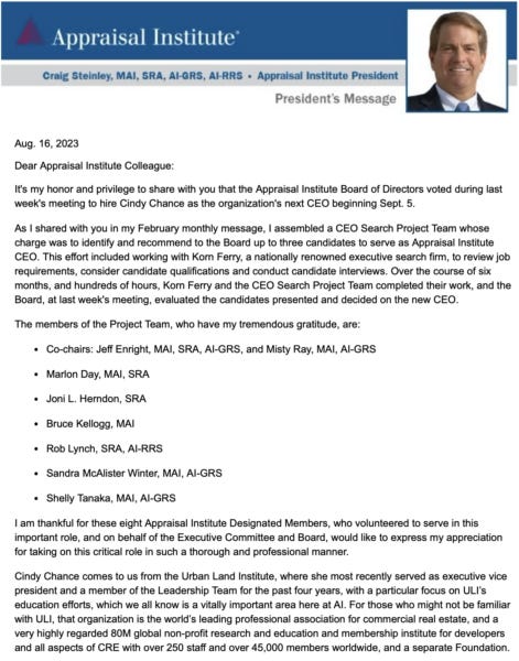 The new CEO is from the Urban Land Institute, and no history with the Appraisal Institute. The search committee used Korn/Ferry, an elite employee search firm. Acting CEO Beata Swacha really wanted the job but as an FOJ, the power base via JA was gone. In fact the board of directors is no longer controlled by FOJs and remaining FOJ leadership of Sandra K. Adomatis, SRA (President-Elect) and Paula K. Konikoff, JD, MAI, AI-GRS (Vice President) who succeed Craig are going to learn the hard rule that both they and the CEO report to the Board of Directors, not the other way around.