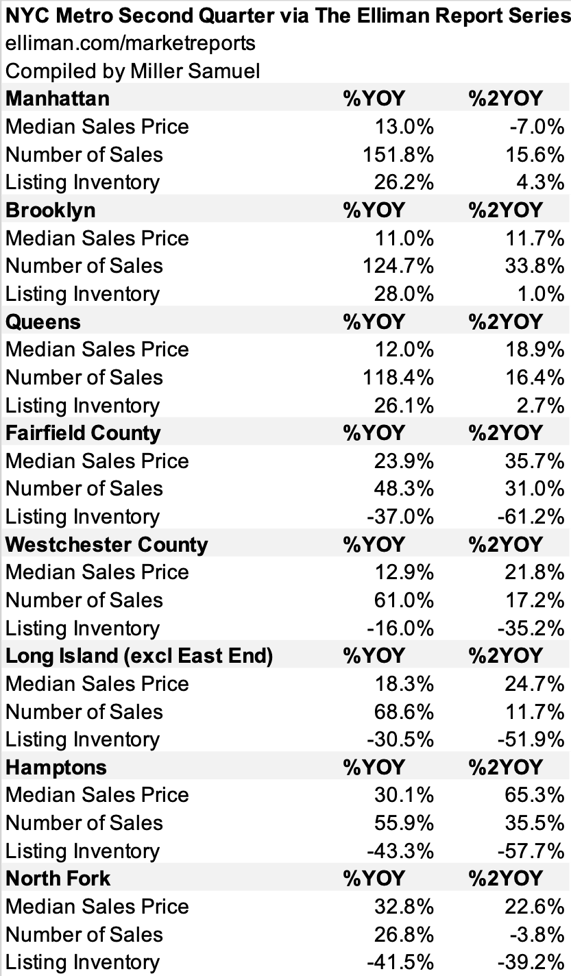 I went through the region using our market report series for Douglas Elliman, comparing the same period two years ago to capture the pre-COVID market. Prices and sales are up with the exception of Manhattan prices and North Fork sales. Listing inventory is up slightly within the city boroughs and plunged in the suburbs.