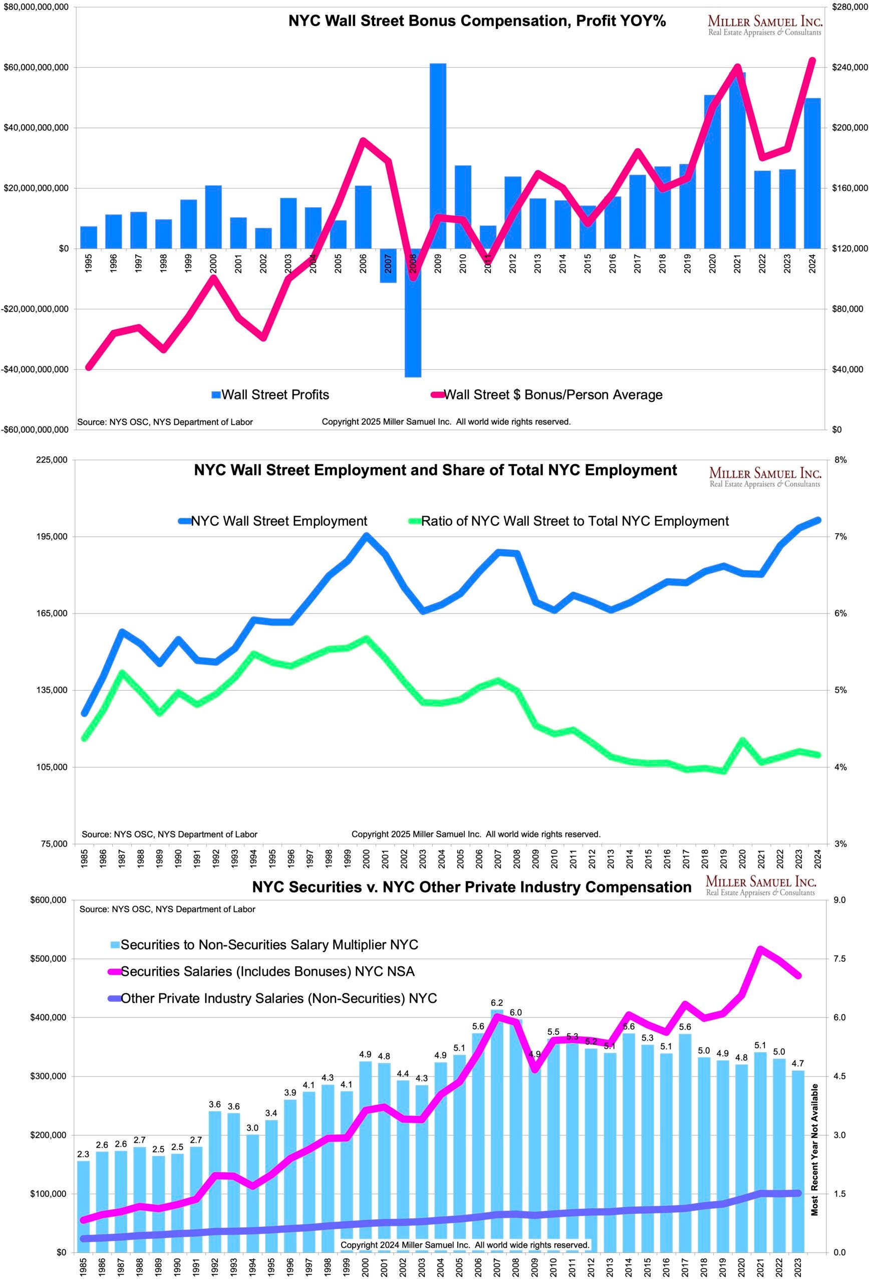 The New York State Comptroller released their annual report on Wall Street profits and average bonus compensation for 2024. It showed the sector made a lot of money [gift link], the most on record in terms of profits and the average bonus per employee. In NYC, Wall Street accounts for about 4% of the jobs and about a quarter of all wages. Obviously, it’s a vital sector of the NYC housing economy.