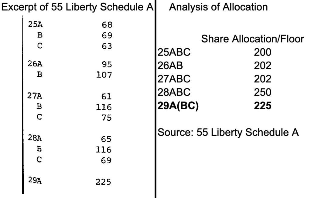 Aside from the former boardroom’s unique and impressive features, I also noticed at the time that its monthly maintenance charges for a full floor seemed lower relative to other apartments in the building. In our business, it is not unusual to see a co-op converter allocate a low number of shares for their personal residence. The smaller allocation results in a lower monthly maintenance charge (equivalent to common charges and real estate taxes in a condo) with the remainder of the apartments picking up the difference. I pulled up the Schedule A from the building conversion plan and totaled the shares allocated on several floors below the 29th which appear to take up a similar overall footprint. The letters below represent the different apartments on each floor at the time of the conversion. In share allocations of a co-op in New York City, they tend to be proportional to the apartment size. Higher floors or better views are generally allocated more shares. I only brought this apartment example up because of my dinosaur memories.