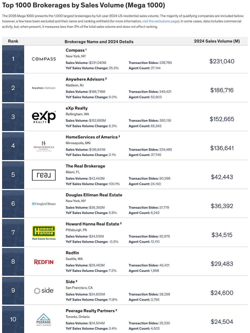 We got the news this morning that the real estate brokerage industry’s Tesla is buying General Motors. My iPhone blew up with the news [gift link] that Compass had purchased Anywhere in an all-stock transaction. I did not see this coming, but I remember this. This morning, my colleagues across the real estate brokerage community chimed in to share their views. Some liked the idea, while others were concerned about a monopoly, and still others thought it wouldn’t change the industry. The deal is a merger, much like Zillow’s acquisition of Trulia more than a decade ago, where Zillow retained the Trulia branding due to consumer loyalty (think Mac vs PC). Corcoran’s CEO emailed her agents this morning, telling them that Compass plans to keep the separate branding once the regulators approve the deal in the latter half of 2026. Given the gutting of federal regulators by DOGE, the timing seems perfect. Although Compass will inherit a ton of debt, an unwieldy management structure, and an outdated business model, it will get a lot more listings to feed into its private network. Anywhere probably got a 100% premium (a wild guess) for their stock based on today’s performance of each company, but this is a long game and Compass may have already won.