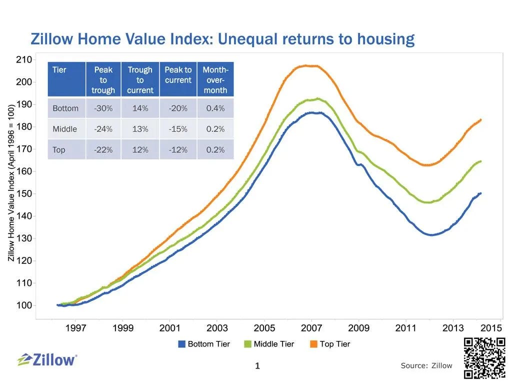 It’s tough to go back to the mid-90s when dating apps started to catch on, but Zillow has a pricing analysis that shows how the top-tier market outperformed the remainder from the mid-1990s to 2015.