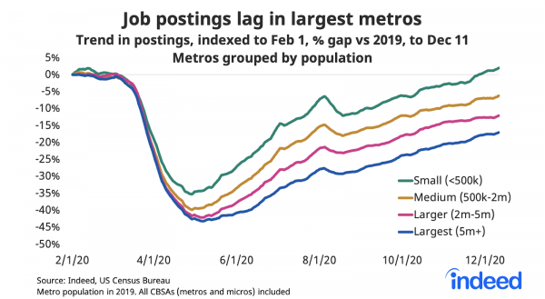 And big cities have been hit harder, showing fewer job postings than smaller cities on a consistent basis during the pandemic.
