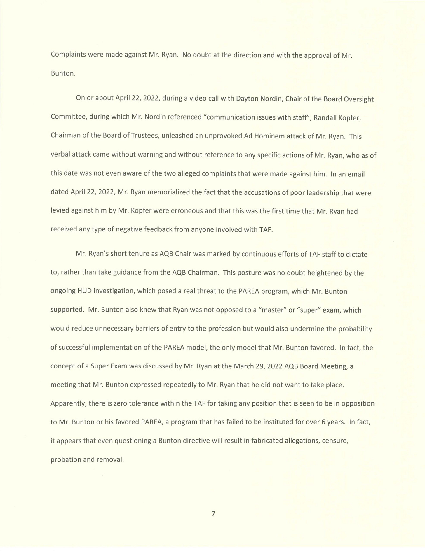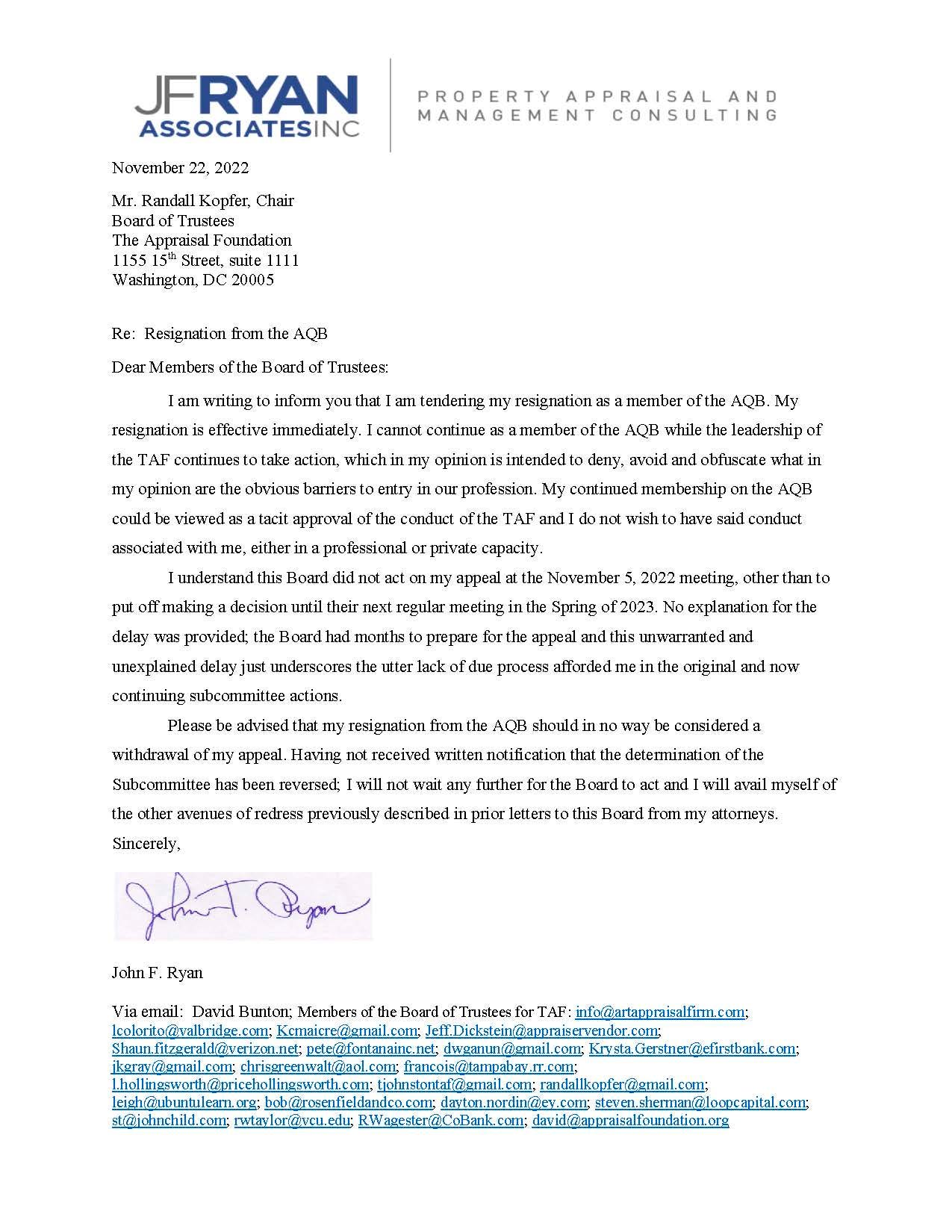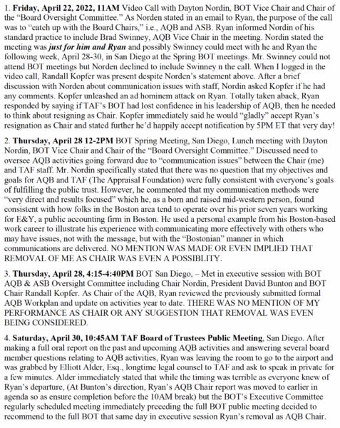 John Ryan, a multi-decade active member of TAF, was forced out of his AQB Chairmanship for daring to address “barriers to entry.” Both ASB and AQB are supposed to operate independently, yet the FODs set the agenda. John dared to go against Dave and was removed from his chairmanship without explanation and then TAF effectively ghosted him. Here is the outline of what happened: