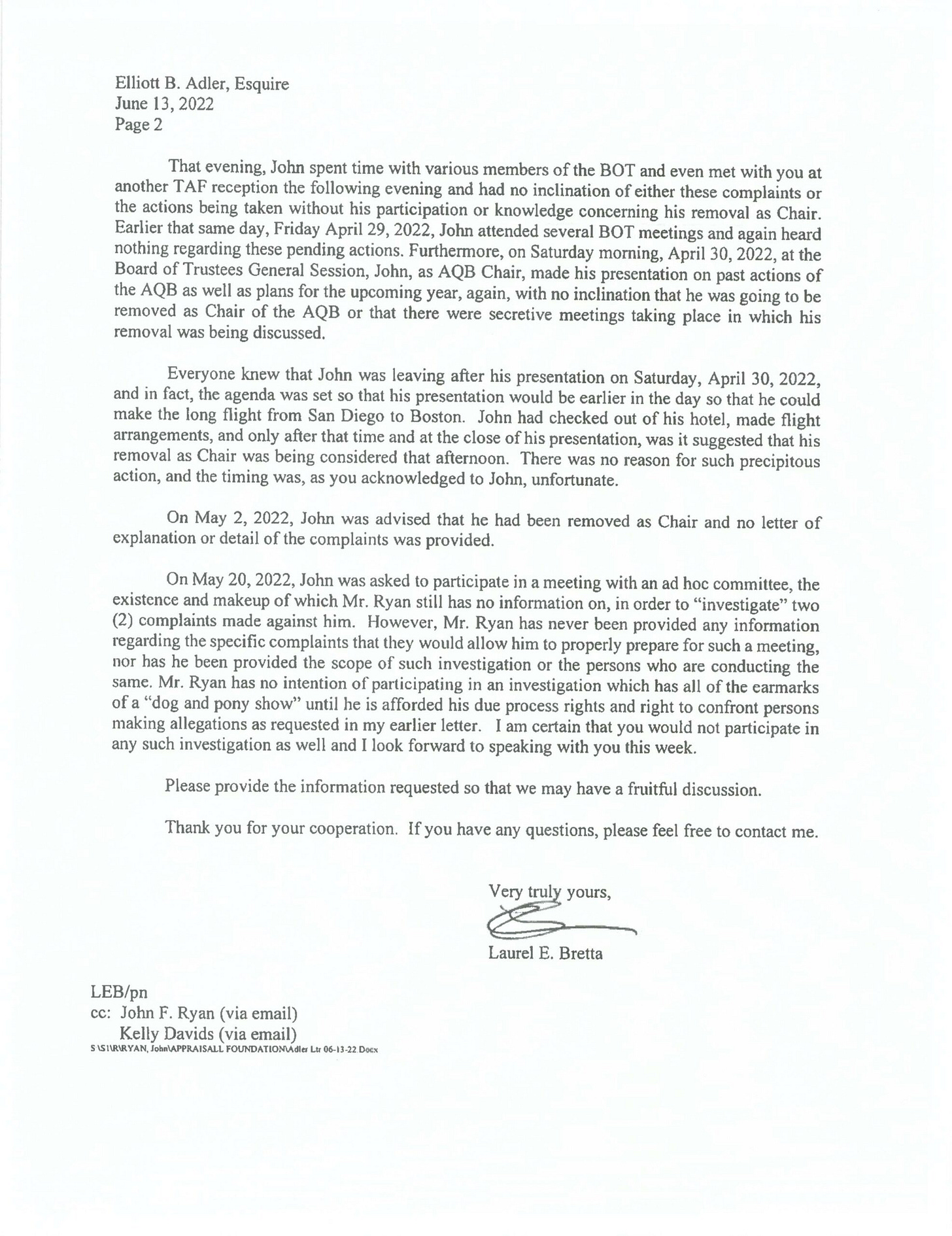 Here is a series of correspondence sent by John Ryan’s attorneys that document AQB and BOT’s actions chronologically, Everyone on the BOT has seen them.