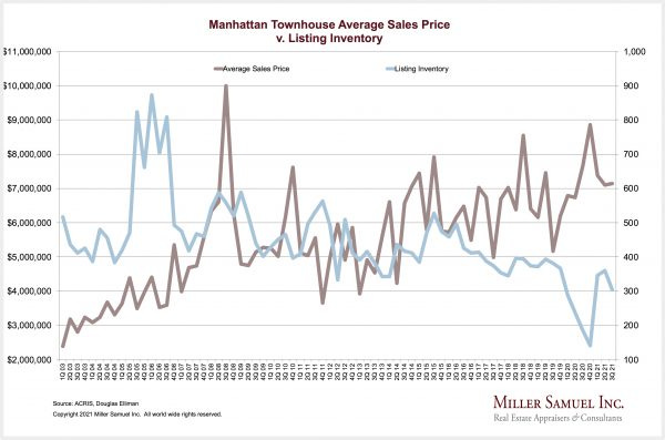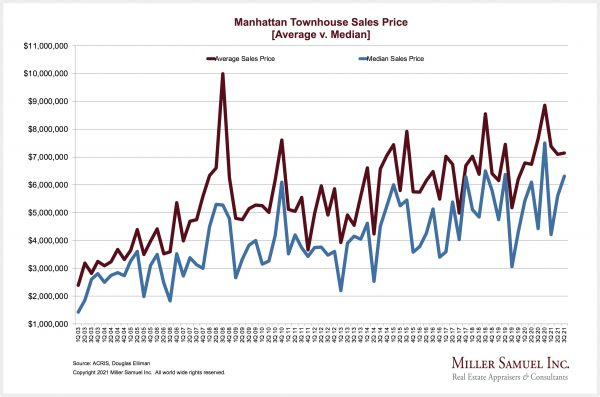 We currently publish an annual Manhattan Townhouse Report for Douglas Elliman (2021 will be released in about a month), but we also chronicle the Manhattan townhouse market with quarterly charts. They’re in our chart gallery and here’s a sample: