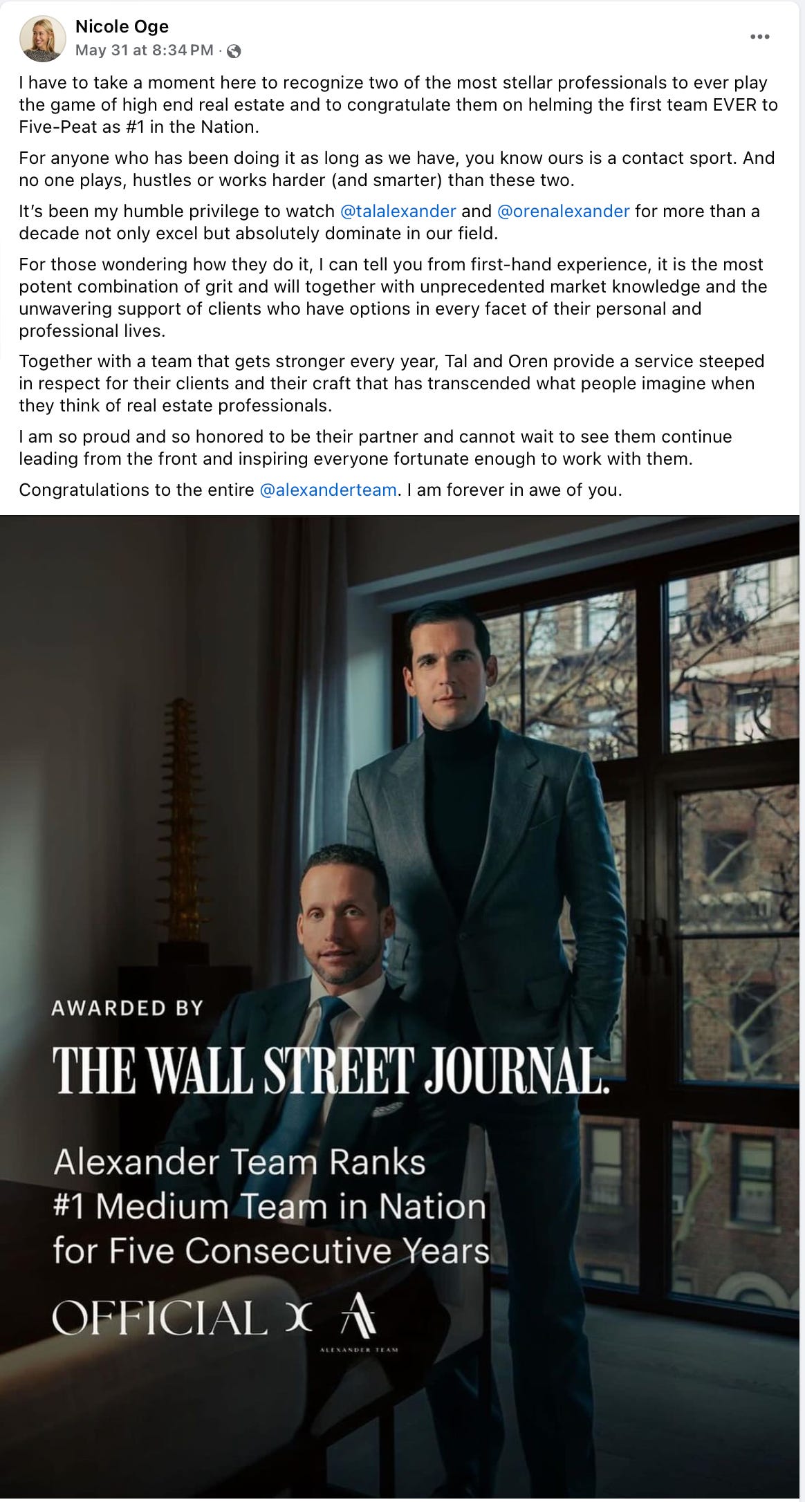 Oge’s post conveyed that the Alexanders are the driving force behind Official Partners, contradicting her recent communications on behalf of the firm.