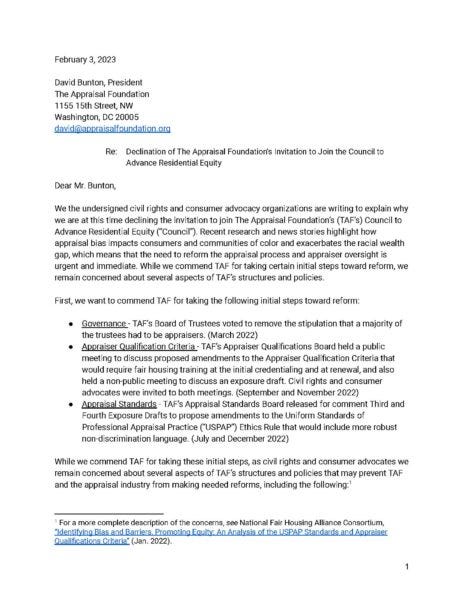 So it wasn’t a surprise to see TAF invite a group of civil rights and consumer advocacy organizations to join CARE rejected. Notice the list of organizations that rejected this blatant chess move by TAF in the letter: