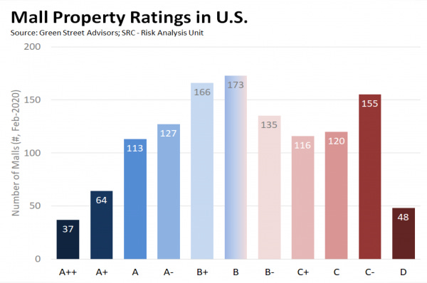 When I was in DC this week, I listened to a presenter from the Atlanta Fed talk about retail real estate risks and malls were front and center. A few years ago this topic was seen as sensationalist as was the phrase “retail apocalypse,” but no longer. The scale of the problem is apparent in the following table, where the vast majority of mall properties are rated “B” or lower.