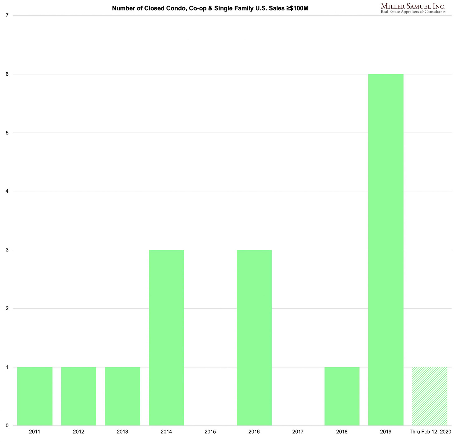 The first known $100 million+ sale occurred in 2011 and by 2014, the market segment was formed. The 2019 market was the high water mark with contributors from LA, New York, and Palm Beach.