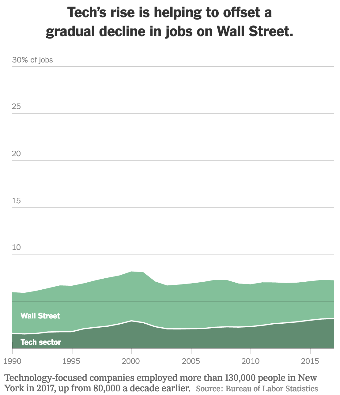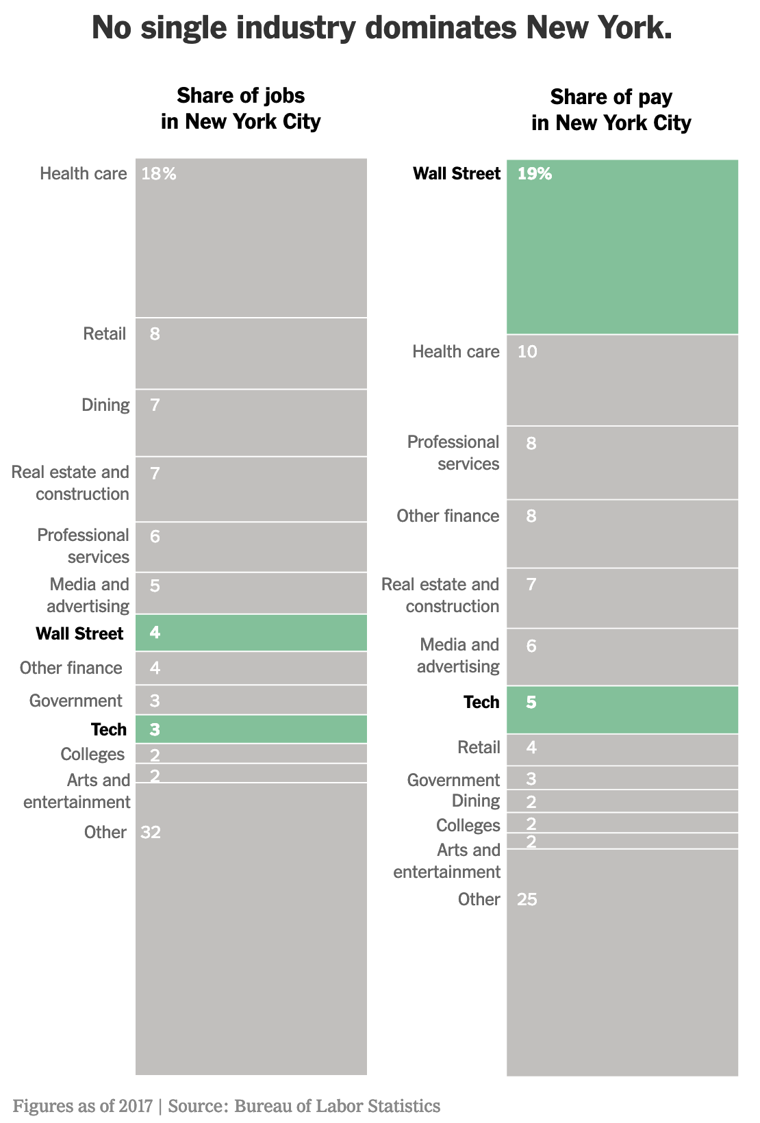 I remember when Wall Street accounted for 23% of the pay, now it is down to 19%. Other sectors have stepped up to fill the void. Here are a few charts from the New York Times piece that give context to the tech and securities role in the NYC economy. Click on the graphics to read the article.