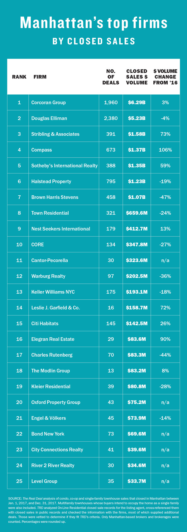 We ranked the top Manhattan residential firms by closed sales in 2017 [The Real Deal NY]