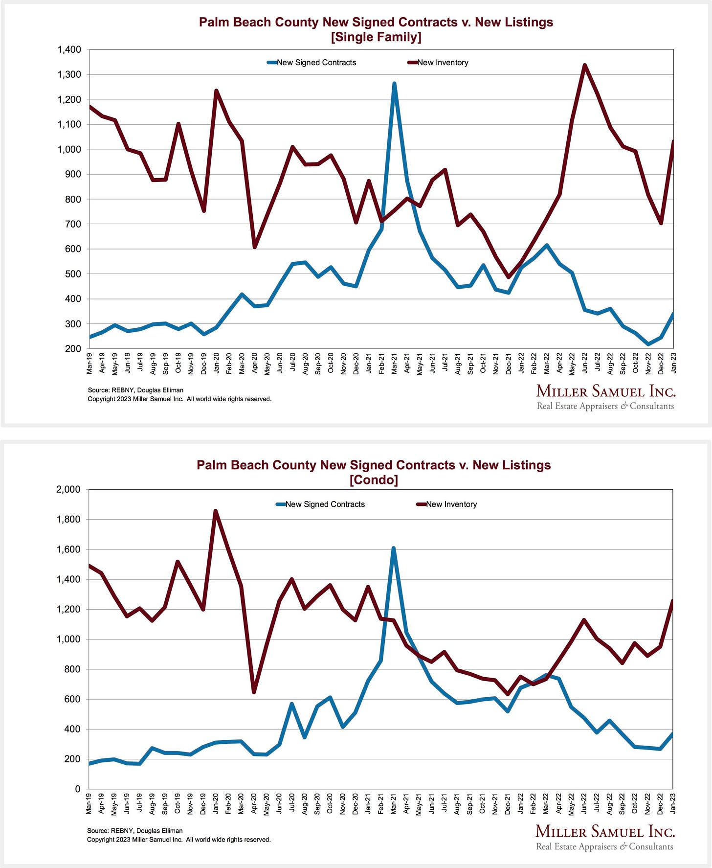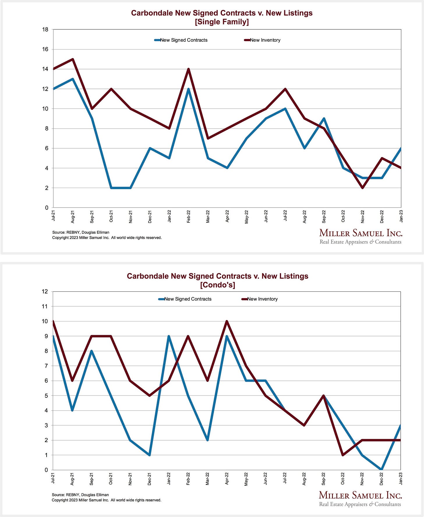 Newly signed contracts declined month over month for the second time in four months as new listings expanded for the first time since September. However, annually, the decline in newly signed contracts has been partially offset by significant decreases in new listings.