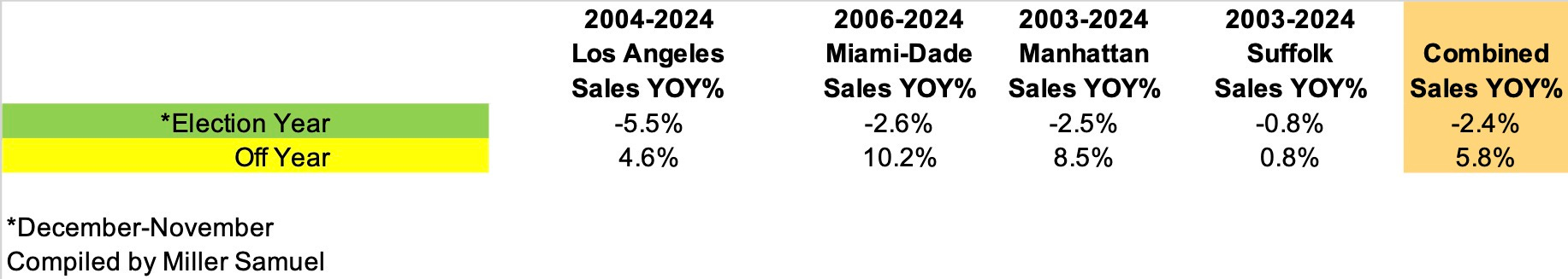 The general pattern that was revealed showed the year before the federal presidential election or midterms (even years), sales slow and then are released the year after the election (odd years). I initially did this analysis with Manhattan co-ops because I could go back quite far, given my data collection here. When the New York Times approached me, I had to pick U.S. markets where I had the deepest data set, and most are limited to about two decades. The years 2004-2006 are when many MLS systems changed technologies and didn’t import past data series into their online systems.