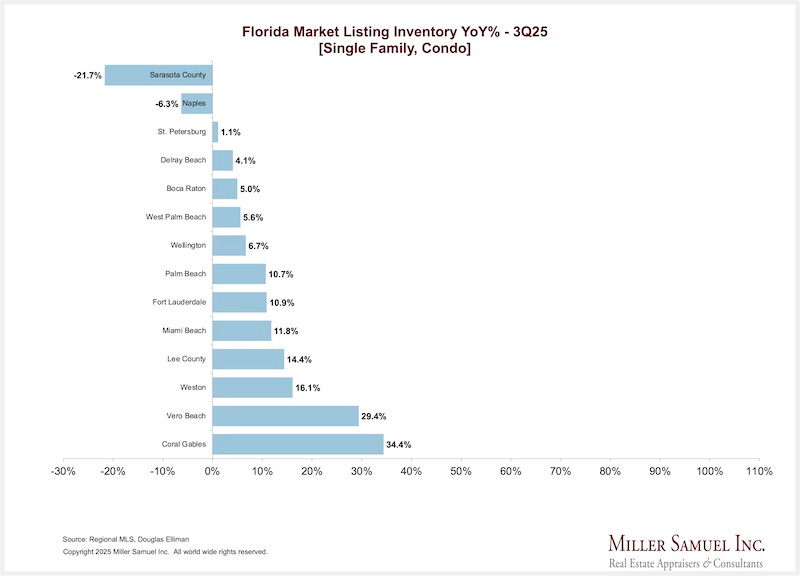 Elevated mortgage rates have slowed condo sales and increased listing inventory, similar to most of the US housing markets. The majority of the 14 housing markets we cover for Douglas Elliman are seeing listing inventory expand, but at a slower rate.