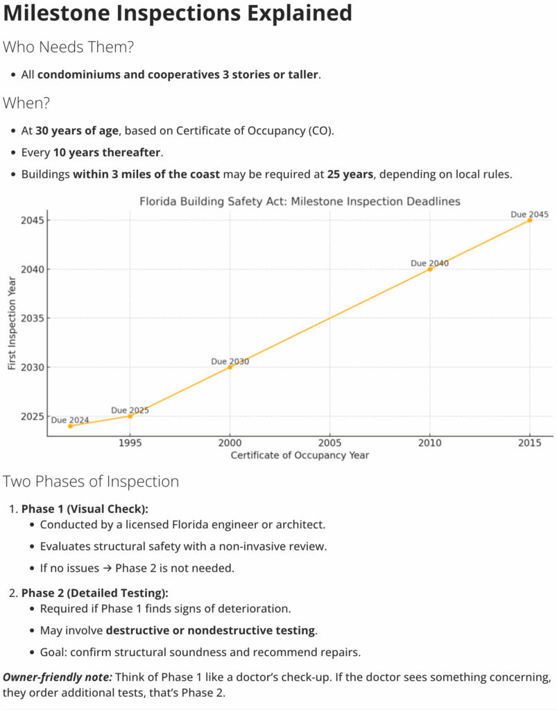 [There is a lot of Florida market stuff shared here so buckle up.] After the Surfside, Florida Champlain Towers collapse more than four years ago, older condominiums have been the focus of a new development opportunity. As a reminder, the tragedy occurred because retirees on fixed incomes who sat on condo boards got to decide whether to spend money on real safety issues or keep monthly charges low—an incredible conflict of interest when human lives are at stake. Many condo associations kicked the safety can down the road, and tragedy eventually ensued. Shortly after Surfside, condo laws were significantly tightened by state and local governments, including the introduction of the Florida Building Safety Act in 2021, at least a dozen buildings in South Florida were deemed unsafe, and many more required urgent mediation. The implementation of a strict set of milestones was introduced (see confusing chart below). To developers, who play the long game, this represented an opportunity to build, buying out condo owners in older projects and tearing them down as the market shifts to favoring new development. However, after this week’s Florida Supreme Court Decision, condo terminations will get a lot more expensive and probably much less likely to occur.