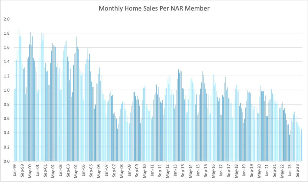 NAR Membership peaked in October of 2022 at ±1.6 million. In February 2024, it slipped below 1.5 million, and I suspect it will be slightly lower than that at the end of 2024.