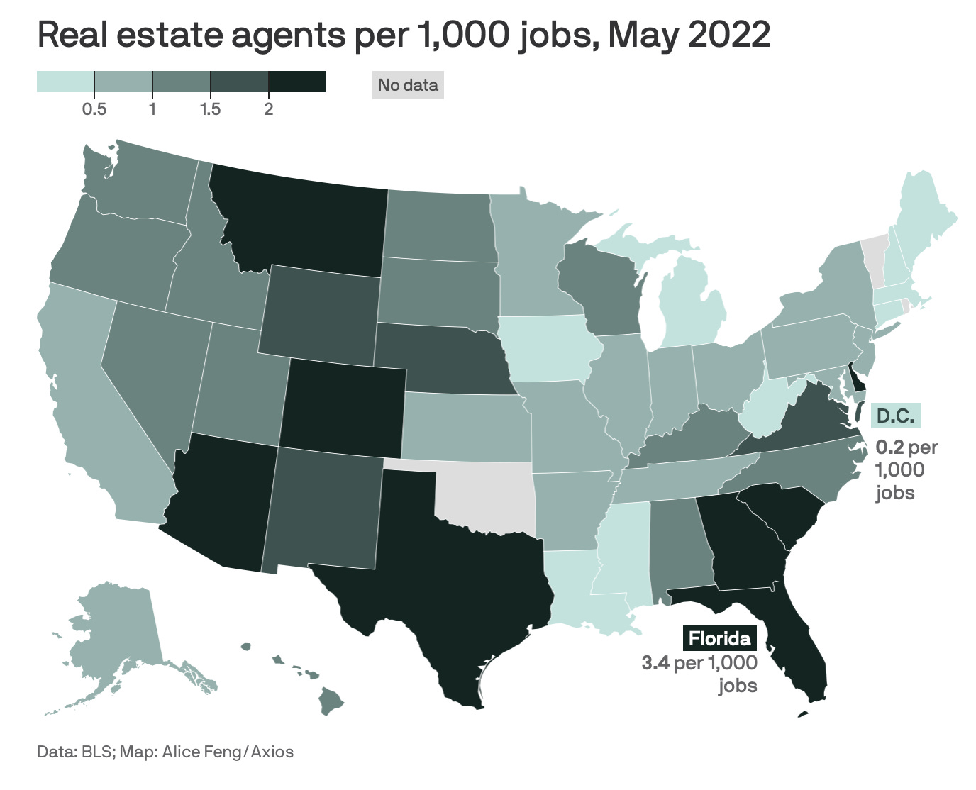 As a ratio to total jobs, Florida has the highest concentration of agents, and the nation’s capital has the lowest. It looks like the opportunity to make a living as a real estate agent is a lot more lucrative in DC.