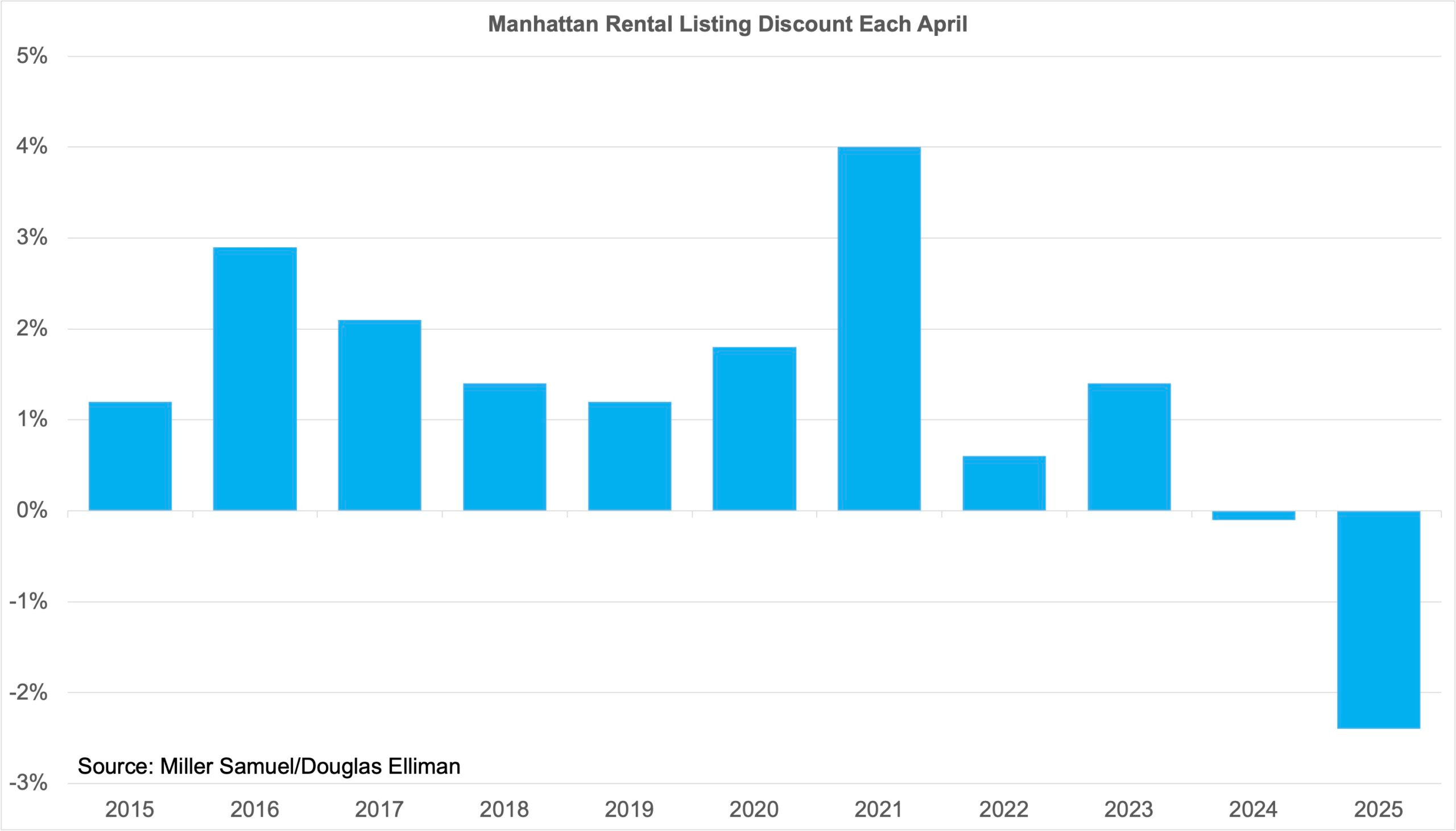 One of the stats I found interesting from our research on the NYC rental market last week involved listing discount, a metric that measures the percentage difference between the listing price and rental price during the period measured. For April, the Manhattan listing discount was -2.4%, or expressed another way, the listing discount was really a listing premium. The average listing price of all rentals in Manhattan was 2.4% below the average rental price across the market. We saw a little bit of that in 2024, but it is a significant amount in 2025 as elevated mortgage rates reallocate demand to the already tight rental market.