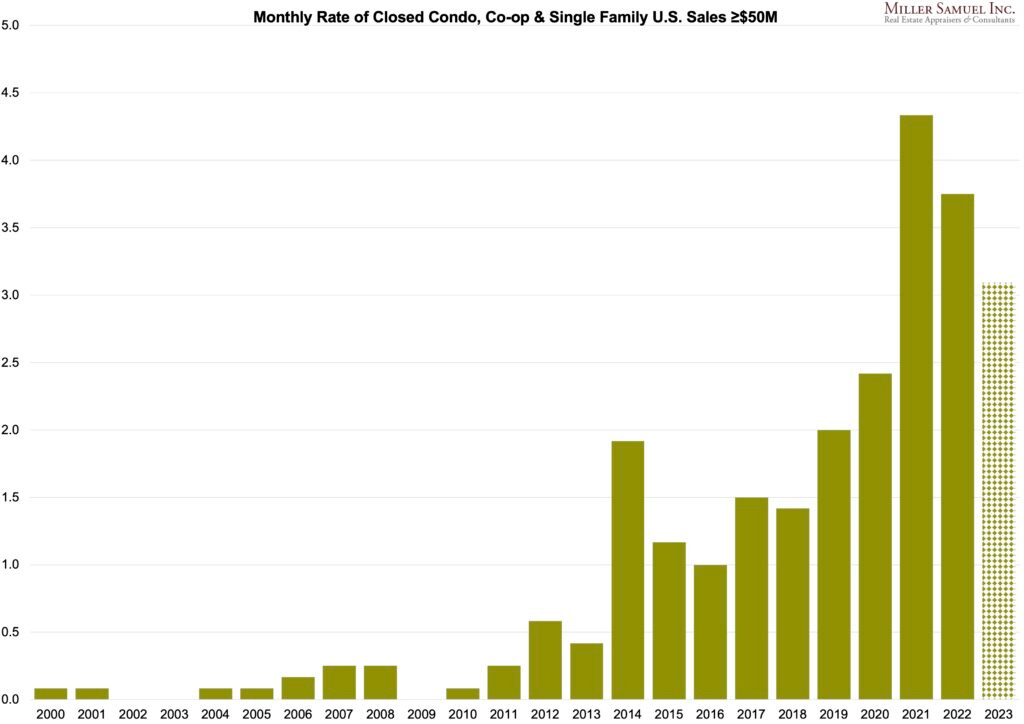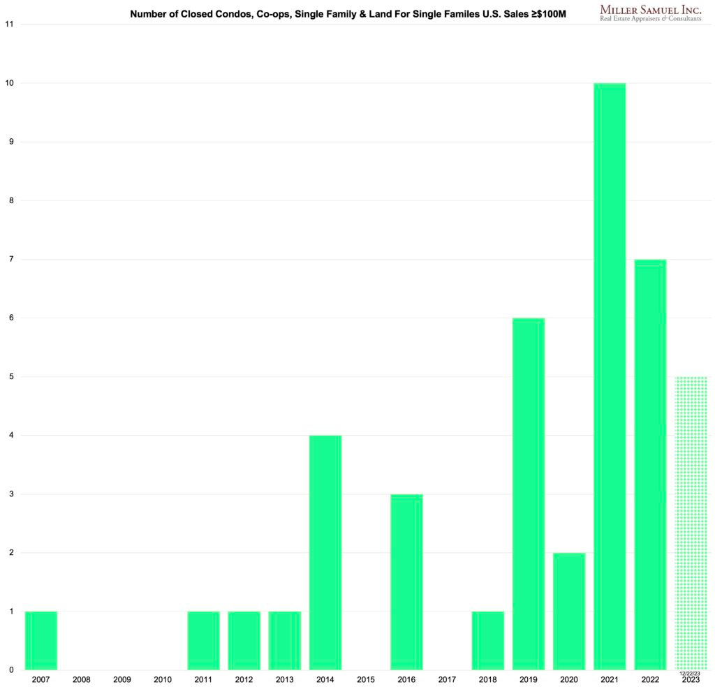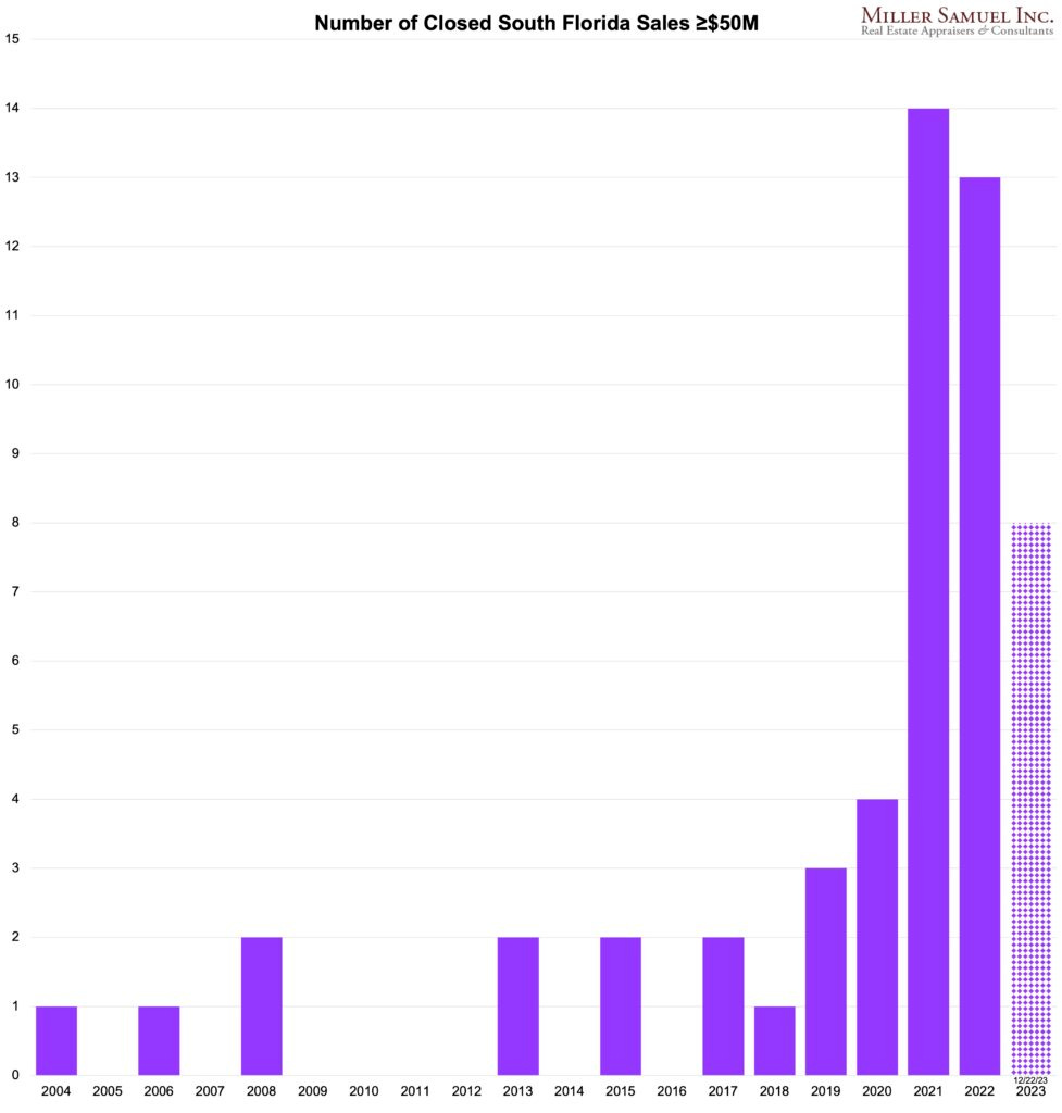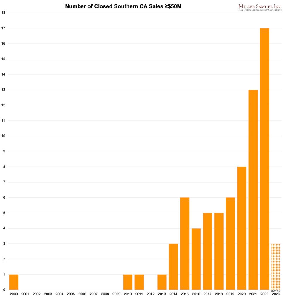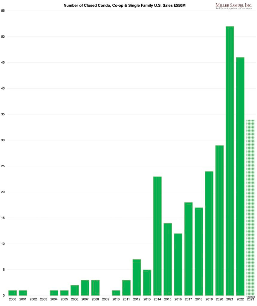 I began tracking the $50 million housing market in 2014 when I noticed that pricing seemed to have reset to a much higher level. After ten years of history, it is clear that this submarket is here to stay. This year – and it is not over yet – saw the third most sales at or above the $50 million threshold, even though we are in a “weak” housing market characterized by lower sales, stable pricing, and less listing inventory.