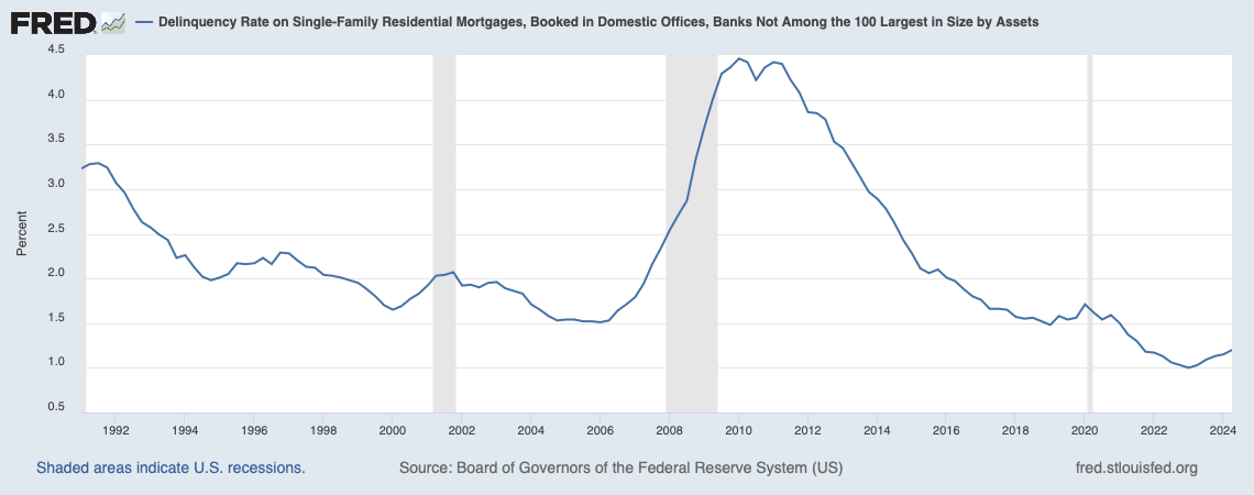 The 5% surge in the formerly steady 64% homeownership to 69% homeownership by 2004 was enabled by Wall Street’s financial engineering of the mortgage space. All the bad stories we’ve heard for years that, in hindsight, sounded insanely stupid, but that’s the poisonous group-think that exists when everyone is making money and doesn’t want the music to stop. U.S. foreclosures surged from 2008 to 2012. Think about Washington Mutual (WAMU) and its idiotic “Power of Yes” advertising campaign. I knew several people at WAMU who couldn’t believe how dumb the bank’s advertising slogan was. It was consistent with their 2006 efforts to shut down all appraisal review functions so that all mortgage applications would be approved. I remember live blogging the moment WAMU shut down their appraisal review departments. It was as hard to believe then as it is now in retrospect. Thankfully, the delinquency rate now is much lower than the pre-housing bubble norm because banks never lost their underwriting minds during the pandemic era.