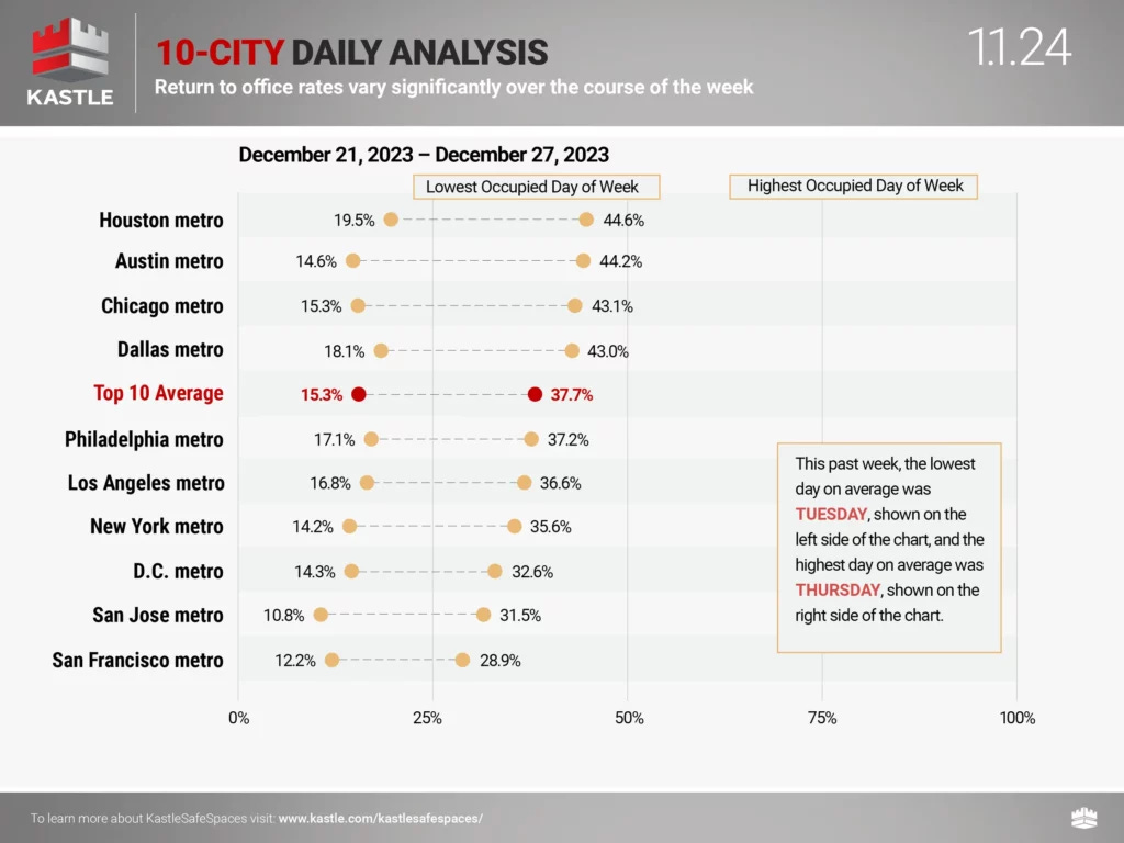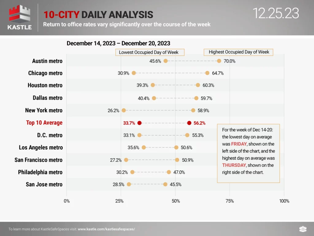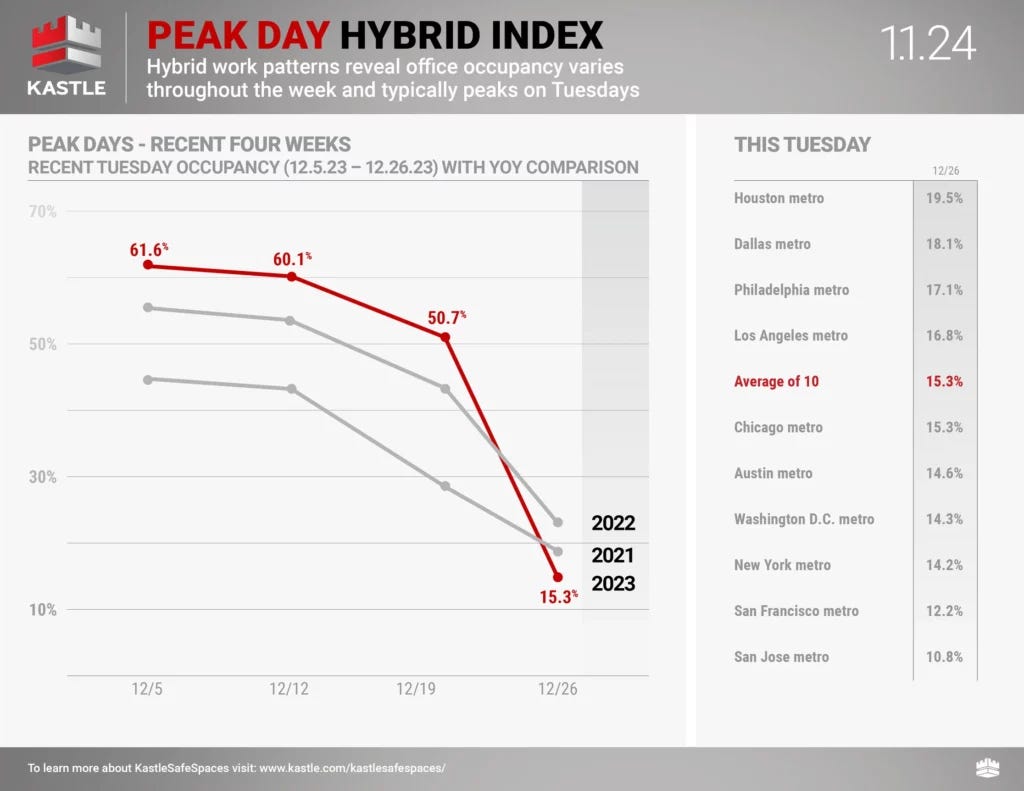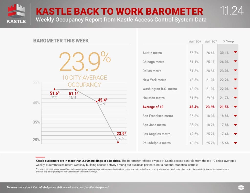 Remember that Kastle charts are overstating occupancy* because their pre-pandemic occupancy benchmark was 100%, which is incorrect (*measures card swipe activity as a proxy for occupancy). Still, they’ve become the standard benchmark for occupancy rates.