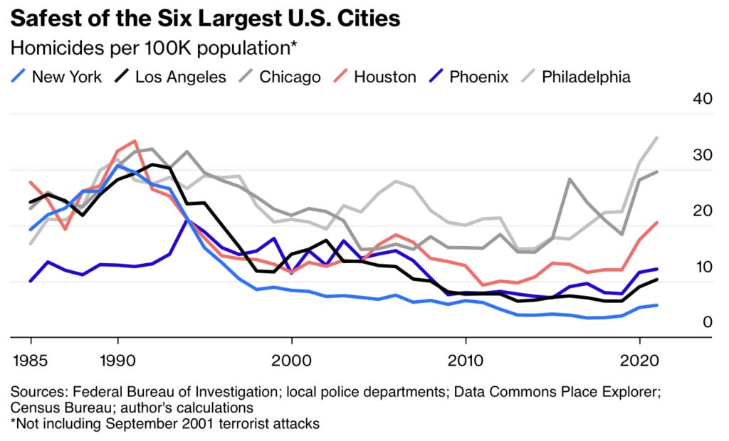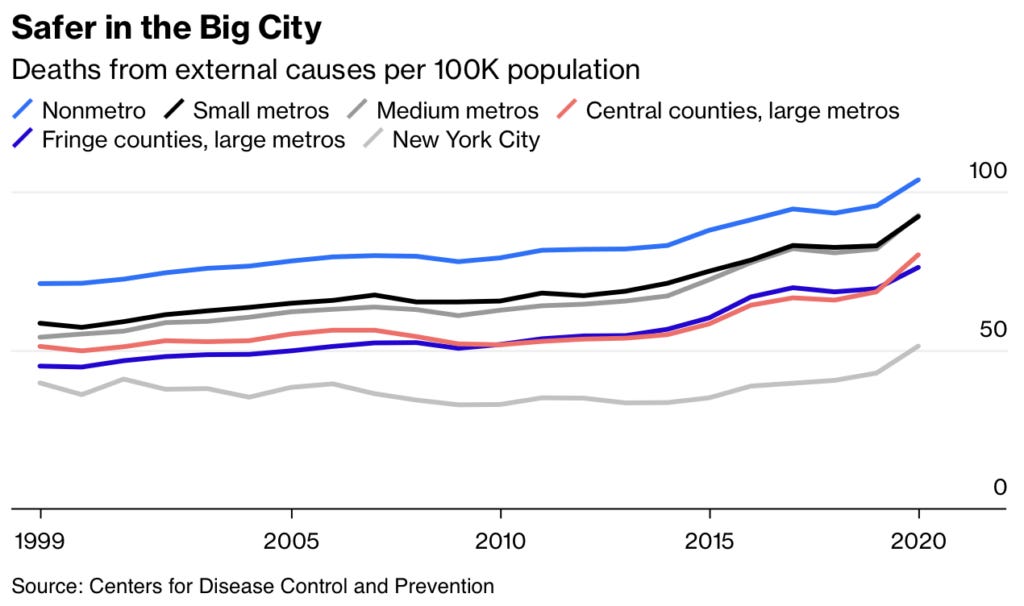 Here’s an excellent piece just out on Bloomberg: New York City Is a Lot Safer Than Small-Town America
