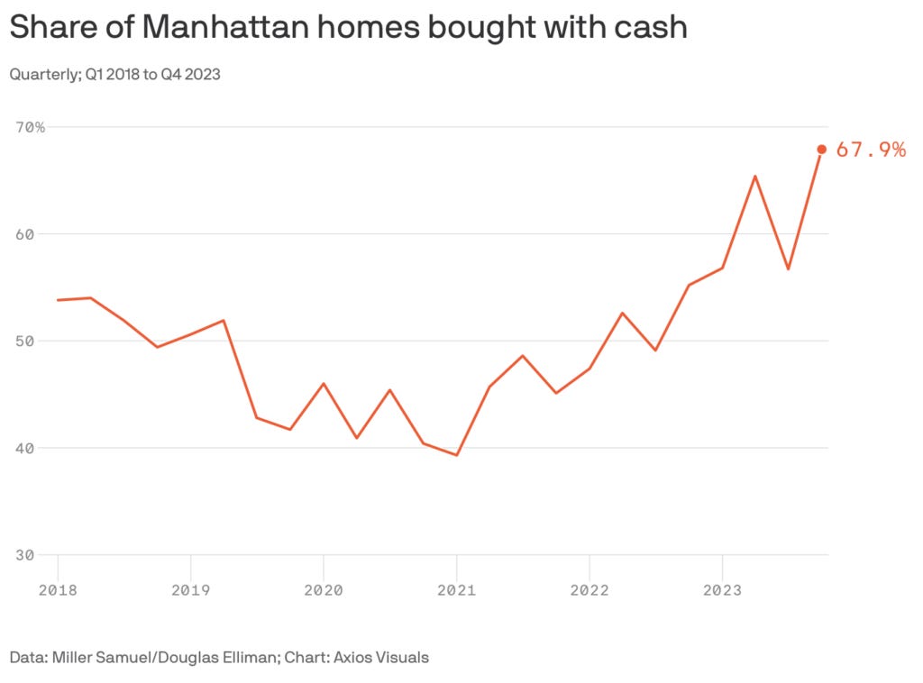 Manhattan is often stereotyped as an “all cash” housing market as the ten-year data from Douglas Elliman shows a 49.9% average since Q1-2014. Axios wrote about this phenomenon in a recent article that included a very cool chart (charts=life) about Manhattan’s record cash share of sales reaching a record of 67.9% (and financed purchases reaching a record low of 32.1%).