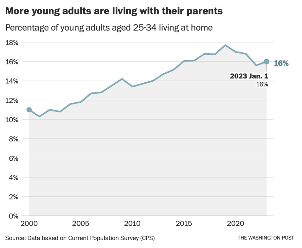 The Washington Post shares NAR research that 27% of millennials are living with their parents in their Millennials have found a way to buy houses: Living with mom and dad. See the chart below from a year ago from a source outside of NAR.