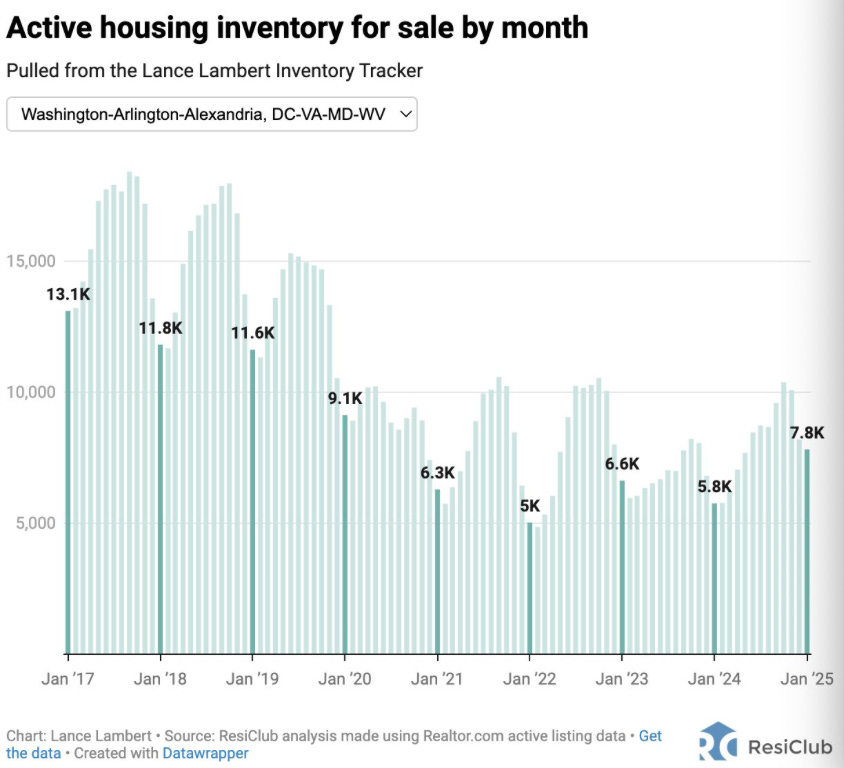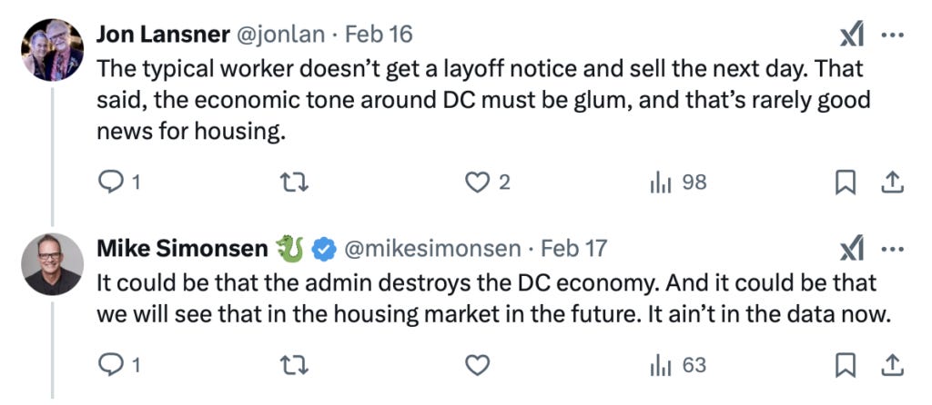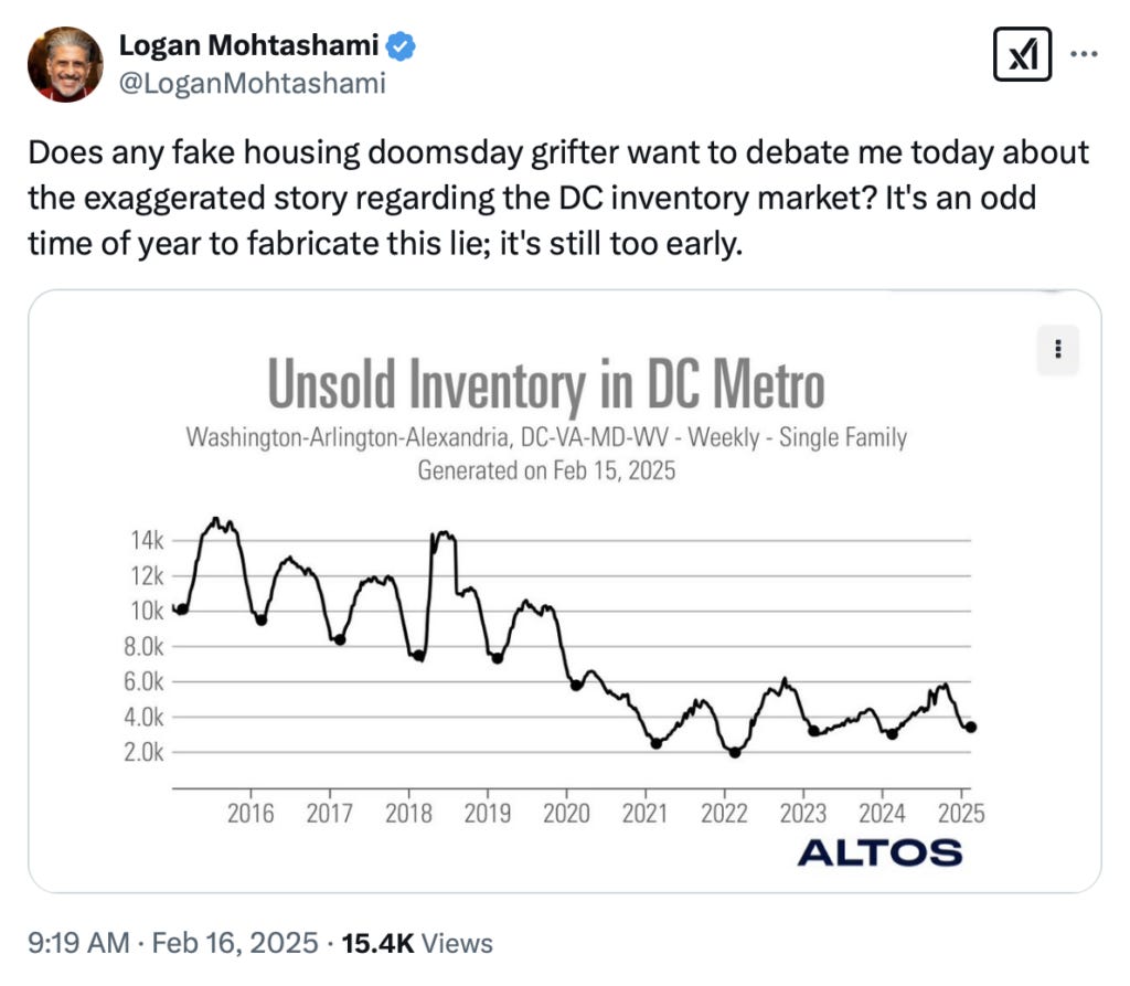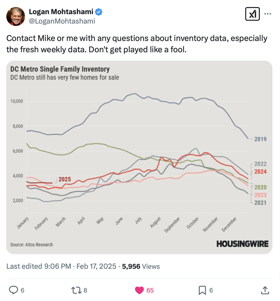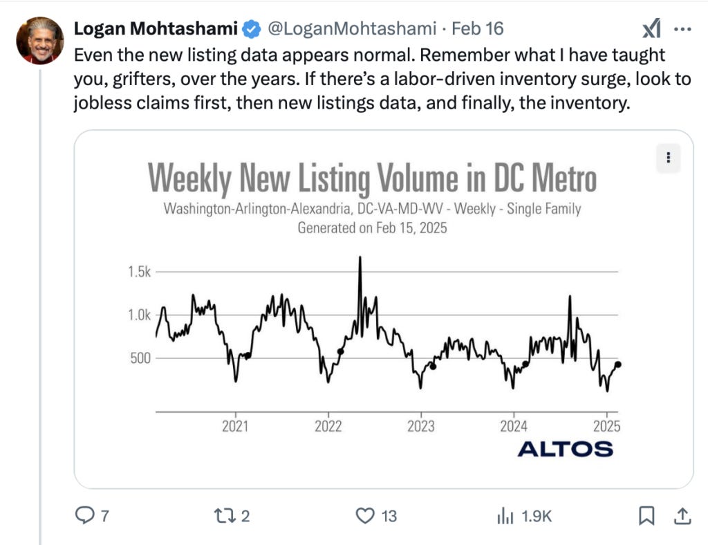 Logan Mohtashami is another Housingwire pundit, and he is all over the false narrative of DOGE layoffs causing the DC metro housing supply to spike. The current data doesn’t show it. The false X/Twitter narrative is made up. However, this doesn’t mean that listing inventory won’t rise if DOGE ends up severely damaging the DC metro economy. There is no evidence of any atypical change in the data right now.