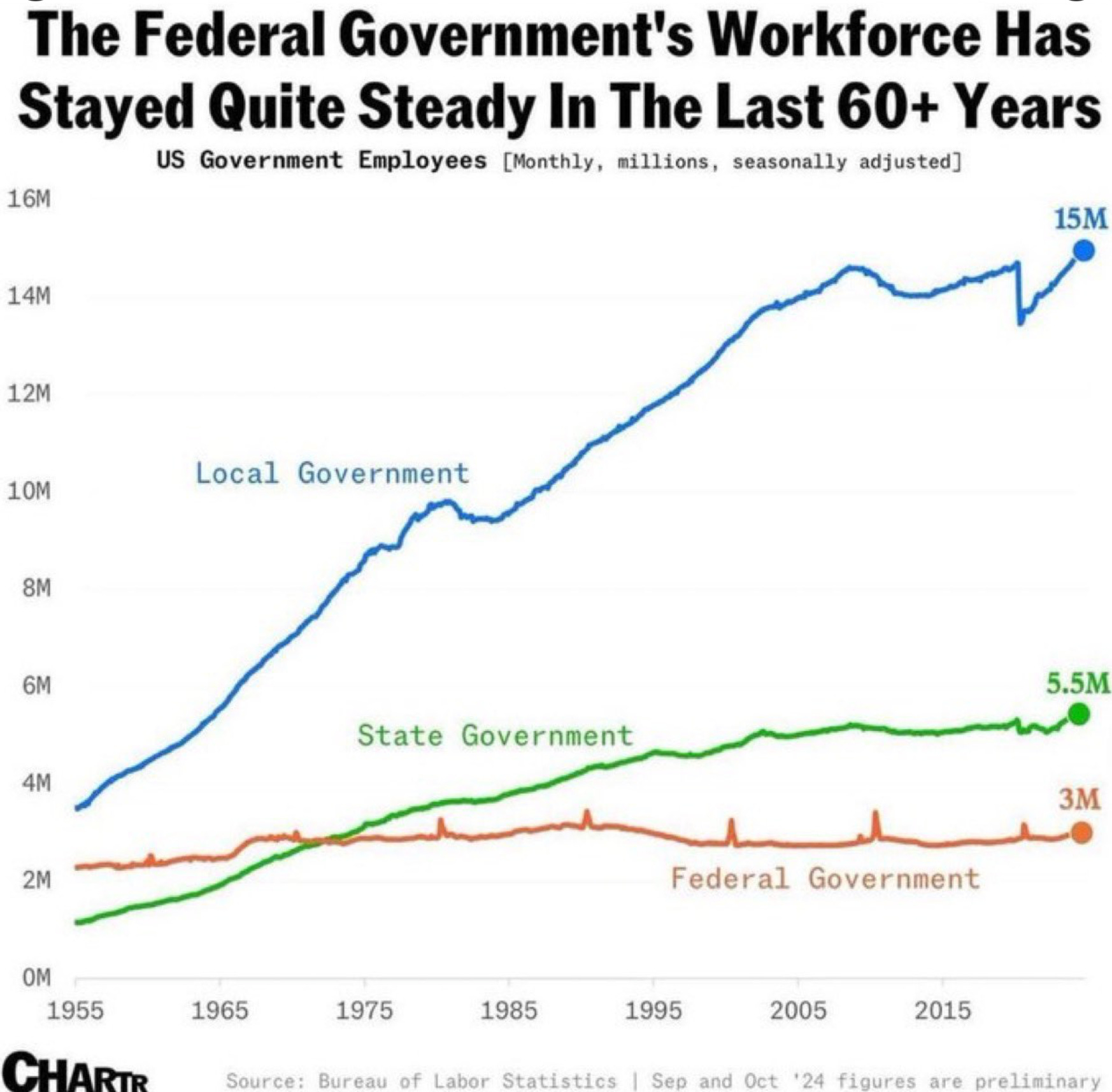 In today’s insanely toxic media environment, chock full of misinformation and misdirection, the housing market is starting to experience something similar. There was a full-on smackdown between credible experts with the actual data and social media trolls looking for clicks on X/Twitter over the past week. Reports of massive federal government layoffs by an unchecked team of roving 20-year-olds from DOGE who don’t know how to build websites have been a big part of the DMV (DC/MD/VA) housing market narrative that listing inventory was surging! I was skeptical, having consulted for the MLS there about 15 years ago and seeing firsthand how the housing market behaves during shifts in administrations. Incidentally, I grew up there, and we never called it “The DMV” – I still think of DMV as the Department of Motor Vehicles. Once respected news outlets, the usual suspects, as well as sketchy X/Twitter feeds, reported without context that listing inventory was surging, and the market was imploding. As an aside, as we see in the following chart, employment in the federal government has remained remarkably stable since the 1950s (of course, this represents the U.S., not DC).