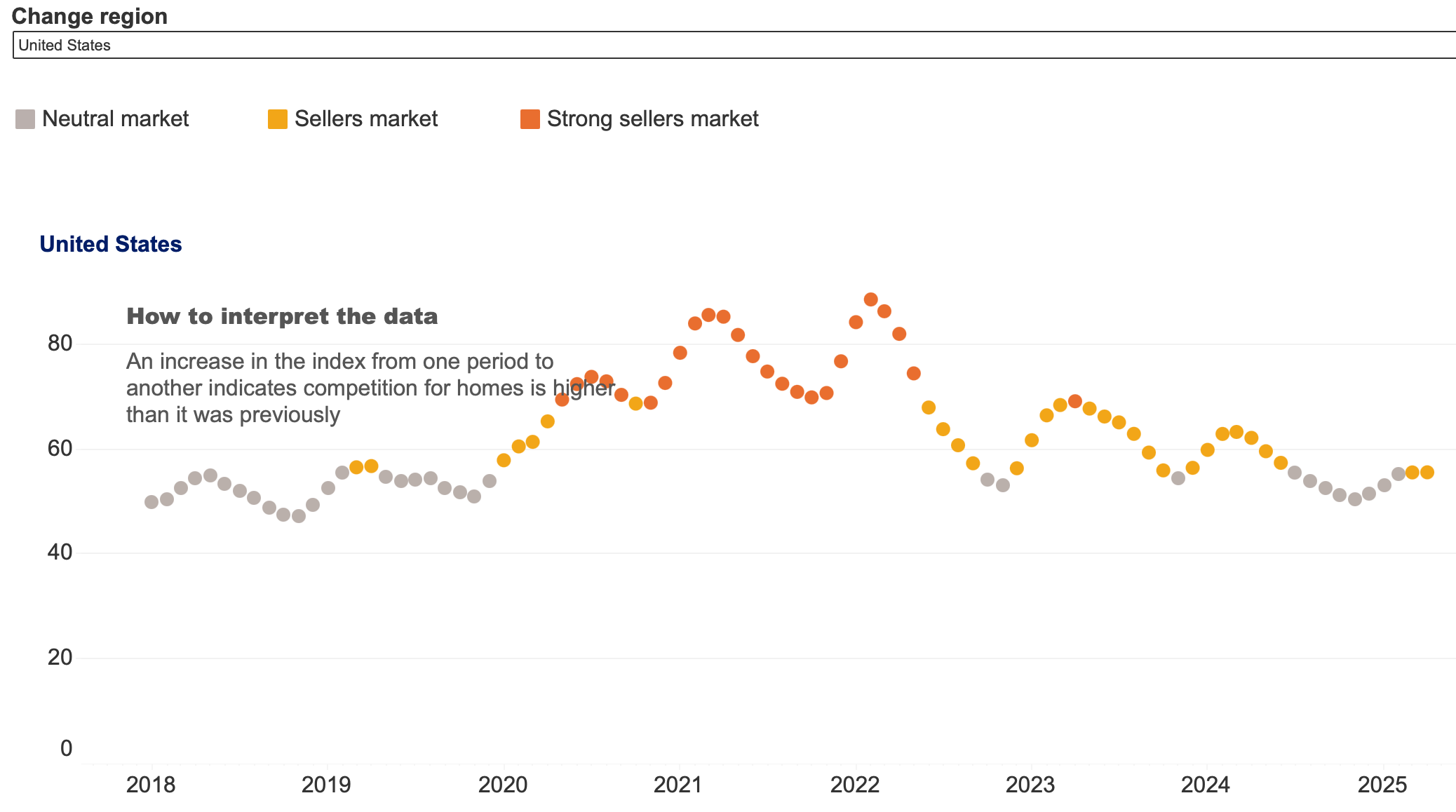 The US housing market peaked in early 2022, which is when the Fed pivoted to influence interest rates higher. The intensity of the US market has weakened since then, according to the Realtor.com Market Hotness Index.