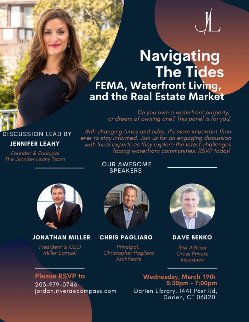 March 19, 2025 [In Person, Darien, CT] – Navigating The Tides: FEMA, Waterfront Living, And The Real Estate Market. RSVP instructions on the flyer.
