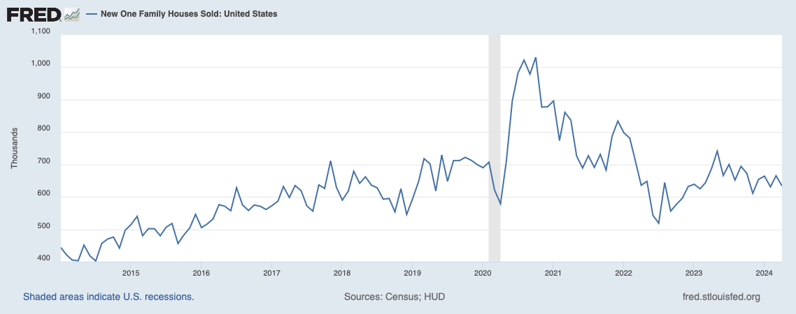 Existing home sales have fallen sharply for two reasons – listing inventory has been historically low (but that’s changing in some markets), and mortgage rates remain a lot higher than during the pandemic (you can thank the lock-in effect). New home sales have stabilized since the Fed pivot in 2022 rather than fall. New supply can be created more directly (not dependent on broad economic changes), and homebuilders have a greater ability than homeowners to buy down mortgage rates.