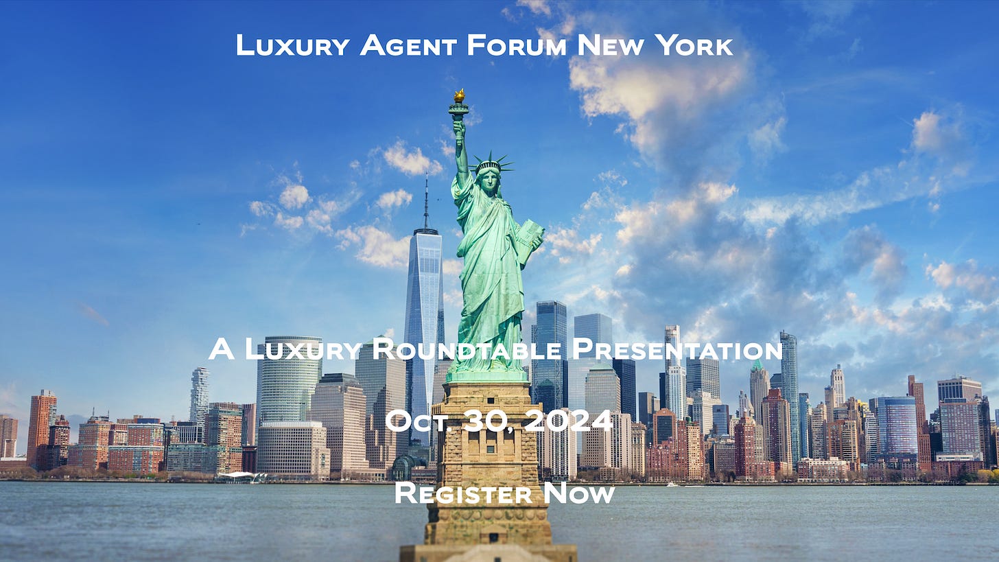 I’m looking forward to speaking at Luxury Roundtable’s exclusive summit in New York on Oct. 30 on the outlook for luxury real estate. Topics include global luxury real estate demand and supply, inventory, feeder markets, regulation, market analysis, design, décor and architecture, HNW and UHNW buying and selling behavior, marketing, developments, best practices in lead gen and referrals, AI and tech, and what works for luxury brands and retailers—experts from the leading luxury real estate networks, brokerages, and brands worldwide. Expect plenty of networking and knowledge sharing. I also have a special speaker discount that gives you 20 percent off the registration fee. Please type in LUX20 when you register for the event: