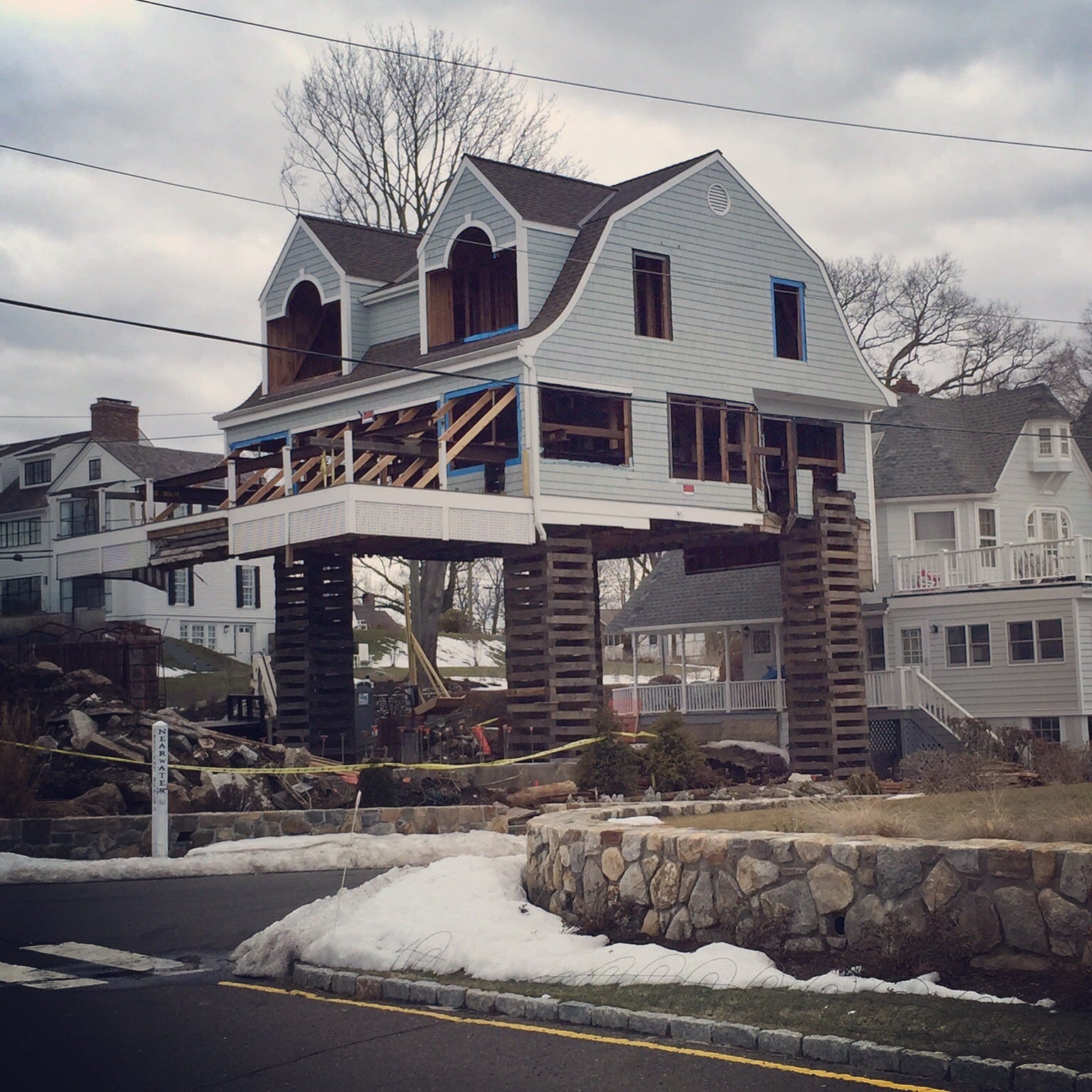 I took the above photo of a house on stilts overlooking Long Island Sound, near my previous home in Connecticut, after Hurricane Sandy in 2012. Every other house in the neighborhood was raised to the average mean flood level to qualify for flood insurance coverage. Those who didn’t raise their homes likely couldn’t afford to since the flood insurance only covered a modest amount of the cost of rebuilding.