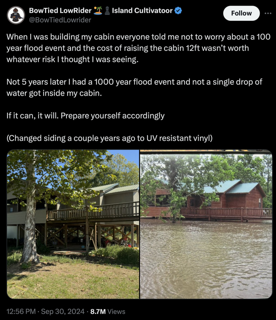 Helene, one of the biggest hurricanes in 50 years, brought renewed focus on flood and disaster insurance. Of the seven states hit by Helene, 21 percent of the homes in coastal counties had flood insurance, but only 0.8% of the homes located within inland counties had flood insurance. Homeowners’ insurance policies essentially don’t cover floods, and many homeowners can’t afford both types of coverage. FEMA dominates coverage through its National Flood Insurance Program, and homes that flood once every 100 years (1% chance per year) are required to have coverage if they have a mortgage. (Speaking of disasters, I wrote this post on the commuter train into Manhattan and forgot my reading glasses).