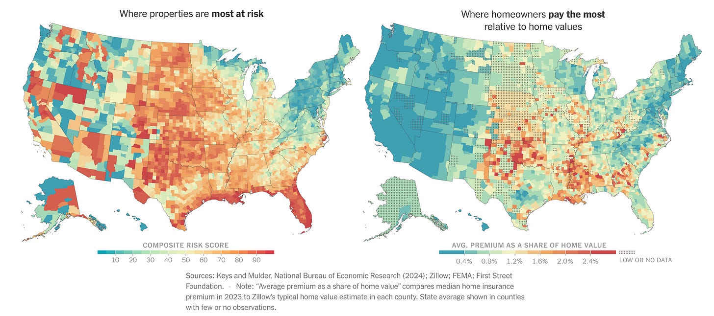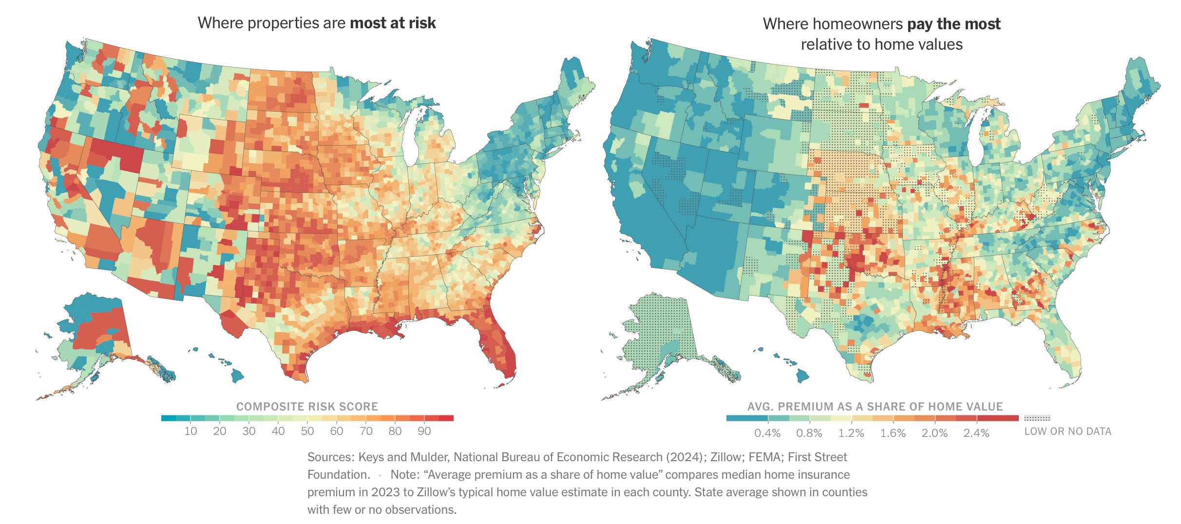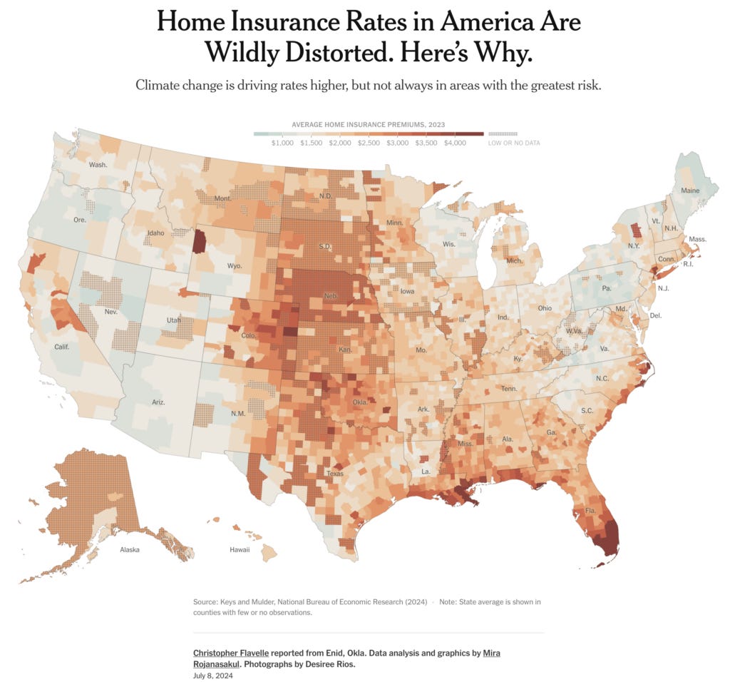 There was a blockbuster New York Times front-page story on homeowners insurance that looked at premium size, location, and where the areas of highest risk are. When a New York Times headline includes one of my favorite words “wildly” then you’d better pay attention.
