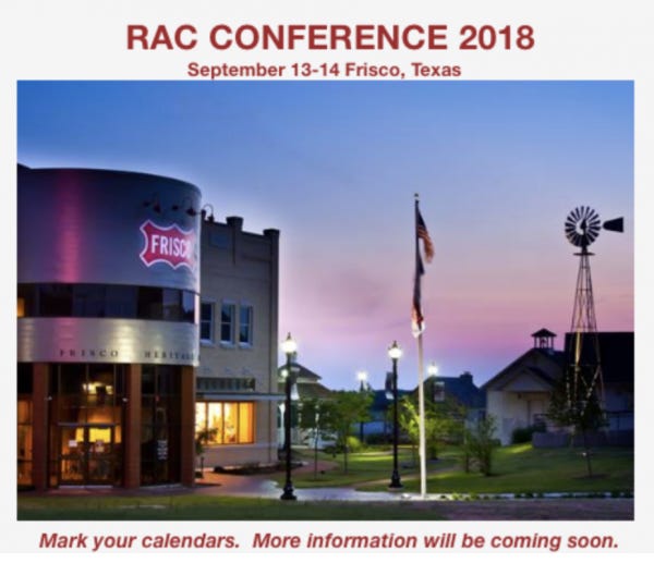 As the president of RAC and am excited to announce our 2018 conference will be held in Frisco on September 13th and 14th. It promises to be a productive, relevant and fun event.