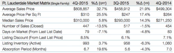 Elliman Report: Fort Lauderdale Sales 4Q 2015 Fort Lauderdale price indicators were mixed as sales remained stable. Single family median sales price surged 14.3% to $310,000 from the year ago quarter. Condo median sales price declined 5.4% to $255,500 over the same period. The remaining price indicators for both property types posted large gains during the same period. Most of the price indicators in the luxury market, representing the top 10% of all sales, showed double-digit gains…