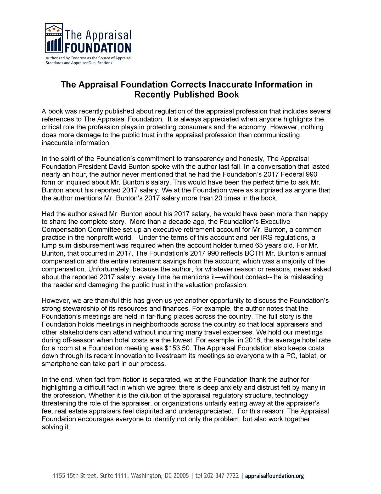 An unsigned, undated memo on Appraisal Foundation letterhead was posted to the blog site “Valuation Nation” on January 22. The memo, citing “inaccurate” reporting in an unnamed recently published book, sought to further explain the 2017 annual pay of David S. Bunton, president of the Appraisal Foundation. The $760,000 pay package for the head of the 14-employee nonprofit, categorized as “compensation” in the Foundation’s Form 990, was reported to have included both an annual CEO pay component alongside an internal retirement-related payout.