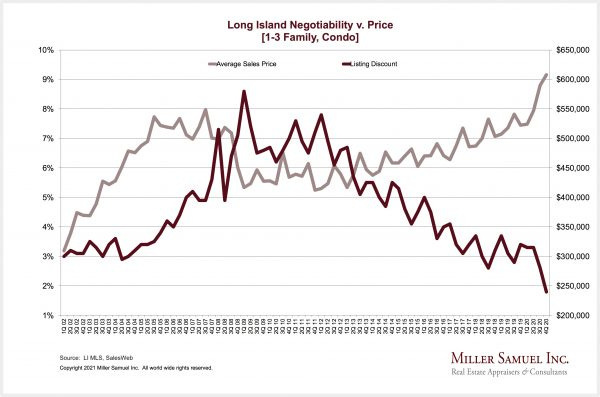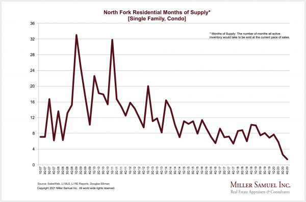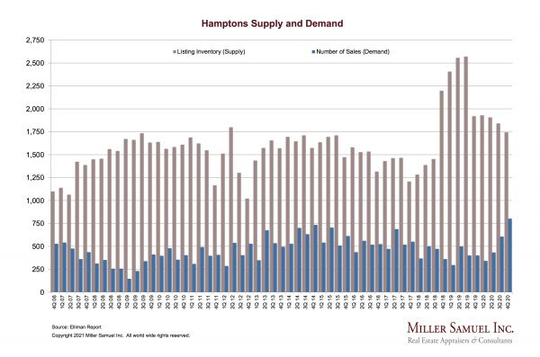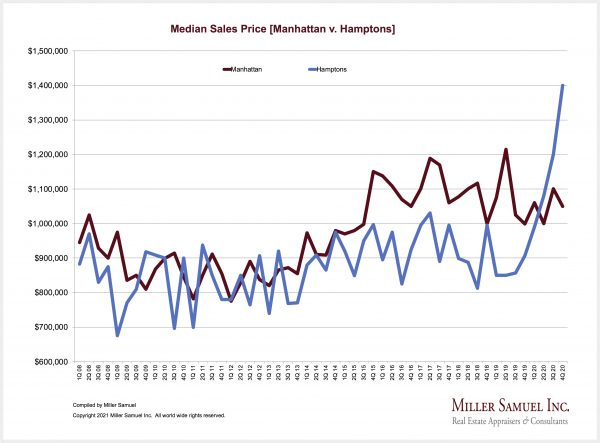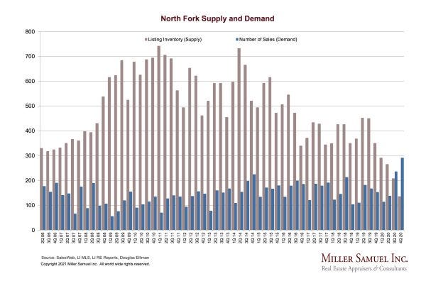 I’ve been the author of the expanding Douglas Elliman market report series since 1994. As I began to cover the Long Island market years ago, it was clear that the East End was joined at the hip with Manhattan and the securities industry. But the housing boom the city enjoyed wasn’t transferred to the East End of Long Island like one would expect although it was part of the remainder of Long Island. Our chart below illustrates how the post-financial crisis pairing broke mid-decade and then the city’s development boom left the Hampton’s behind until the global pandemic. Coprimary is my word to describe the phenomenon where second home housing markets become viewed as a primary or an alternative primary market, largely enabled by the proliferation of remote work during the pandemic.